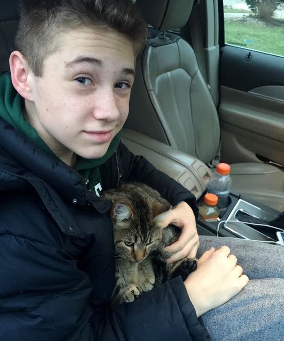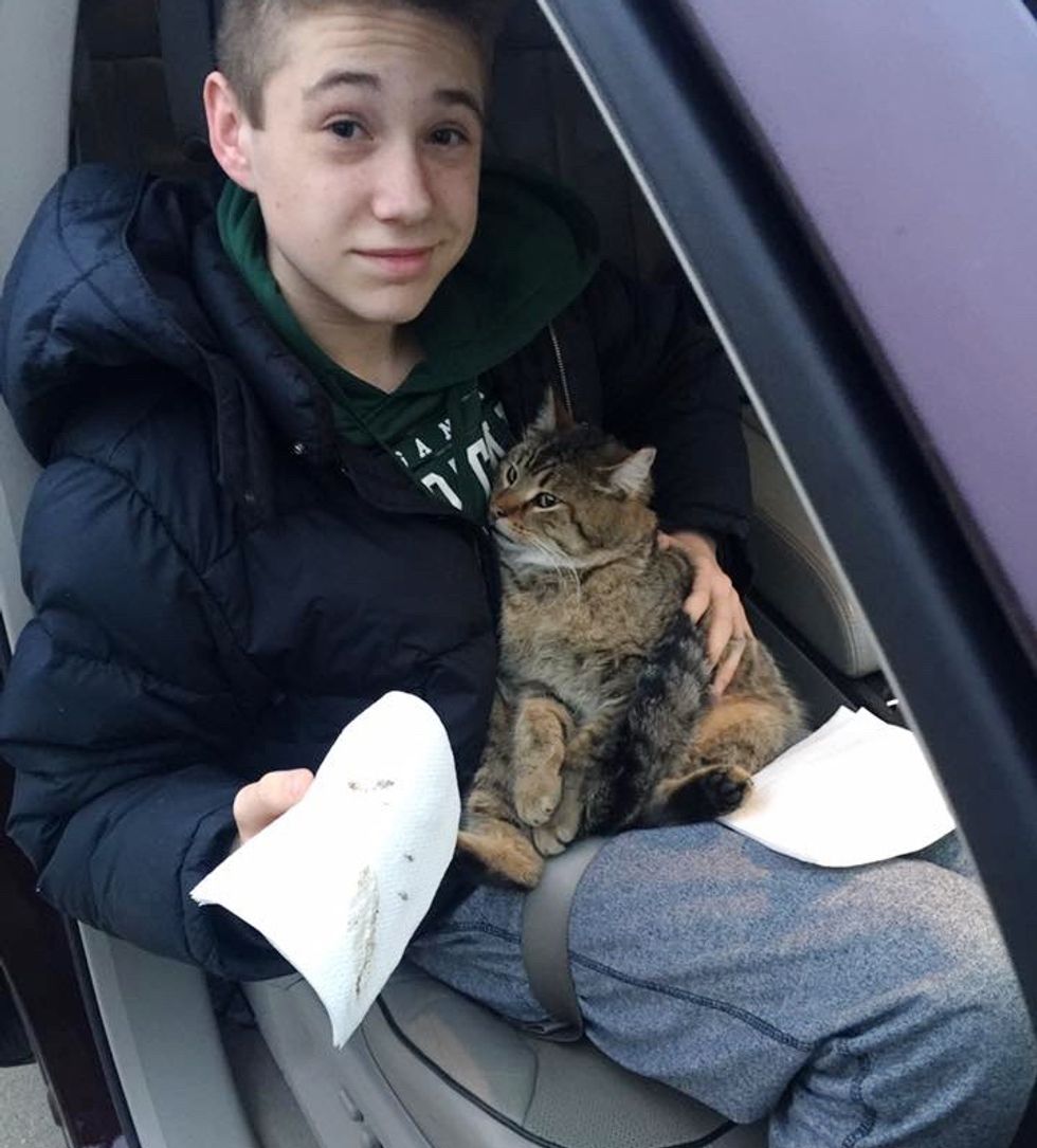 A cat was tossed out a window from a moving vehicle in front of them. As she came to a stop, her son, Gavin, bolted out of the car and signaled the incoming traffic to stop, so he could get to the cat and rescue him.