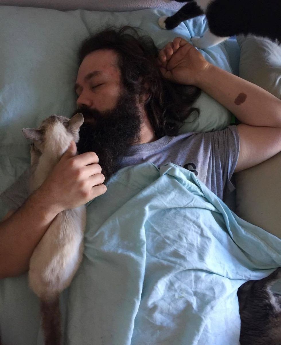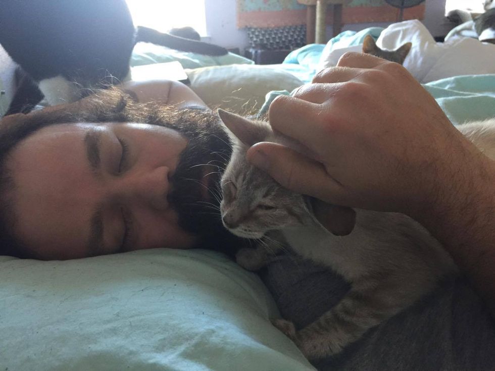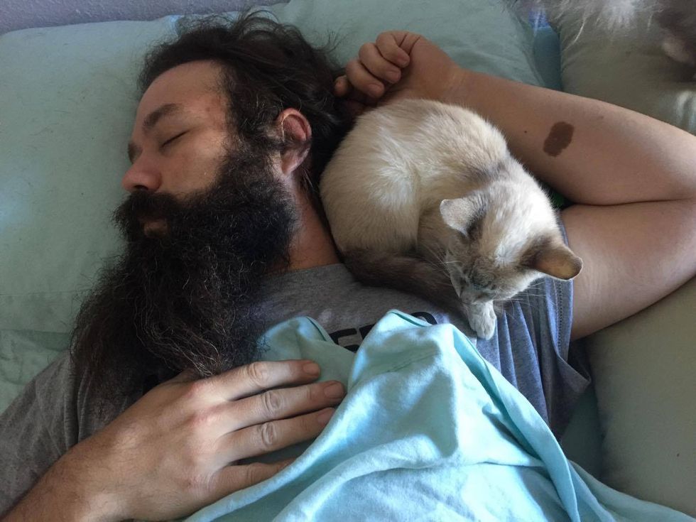 Coconuts nuzzles in his arms for some cuddles while he naps.