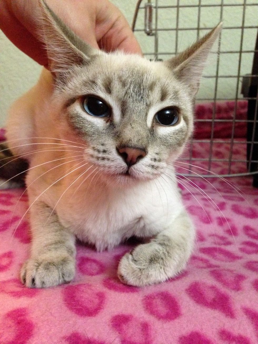 This miniature kitty is two years old but the size of a three month old kitten. She is a special little cat, who was less than a pound when they rescued her from death row.