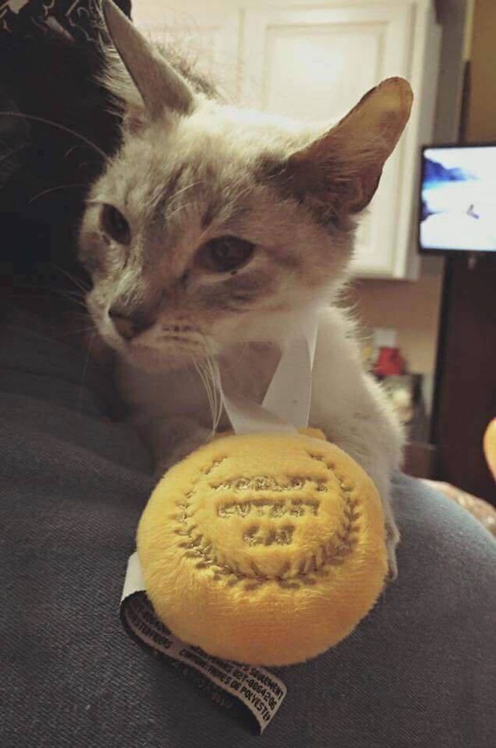 Coconuts shows off her gold medal for World's Cutest Cat. She's well deserved!