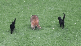 In late October, 2014, two little black kittens showed up on the outskirts of their yard as the raccoon came for his daily refreshment. The kitties befriended him and started following him around, like his very own bodyguards.