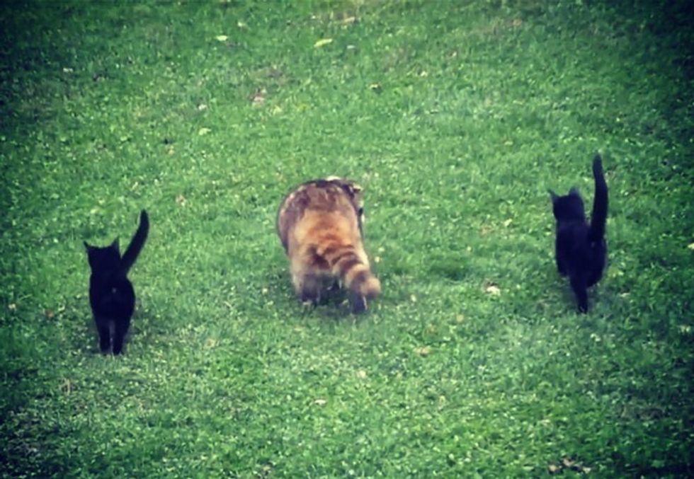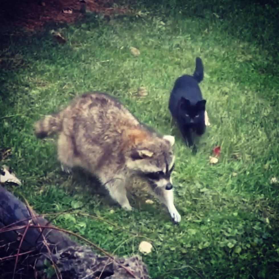When the raccoon came for feeding, the kittens tagged along as they quickly learned that their buddy would lead them to a plentiful food source.