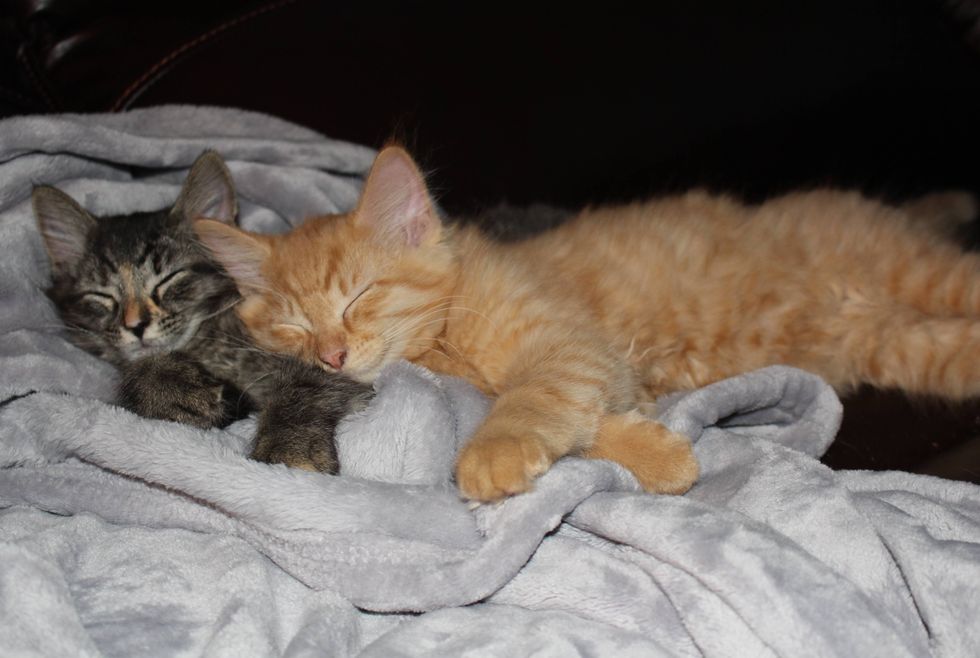 Renley is the ginger and Lili is the grey kitty. After they moved into their new home, Renley displayed his classic ginger personality by getting comfy with his little tummy out, nestling with his sister in their newly chosen bed.