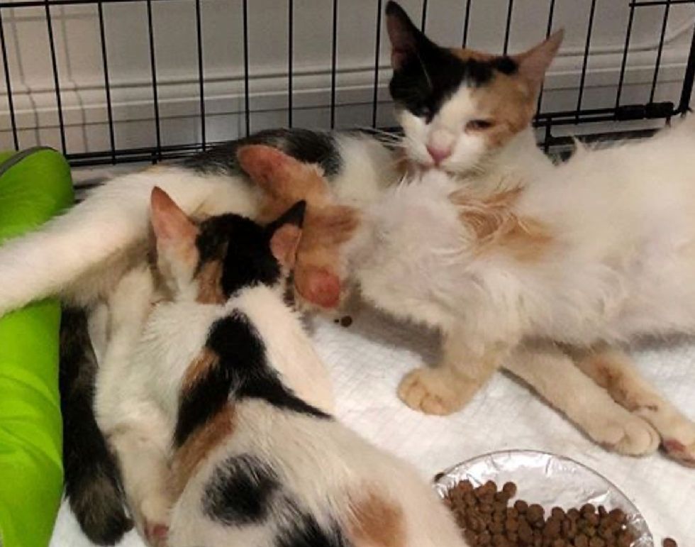 The cat mom and her kittens were given the medical attention they desperately needed. They were very thin and had a lot of filling out to do.