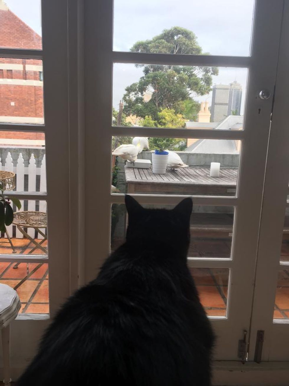 "Day 6 with no interwebs, the natives are getting restless... I've got to go to work now so I have to leave Kittie Smalls to her own devices. She says who needs Netflix when you have some stars from National Geographic on your balcony! She's a bit starstruck. Or hungry."