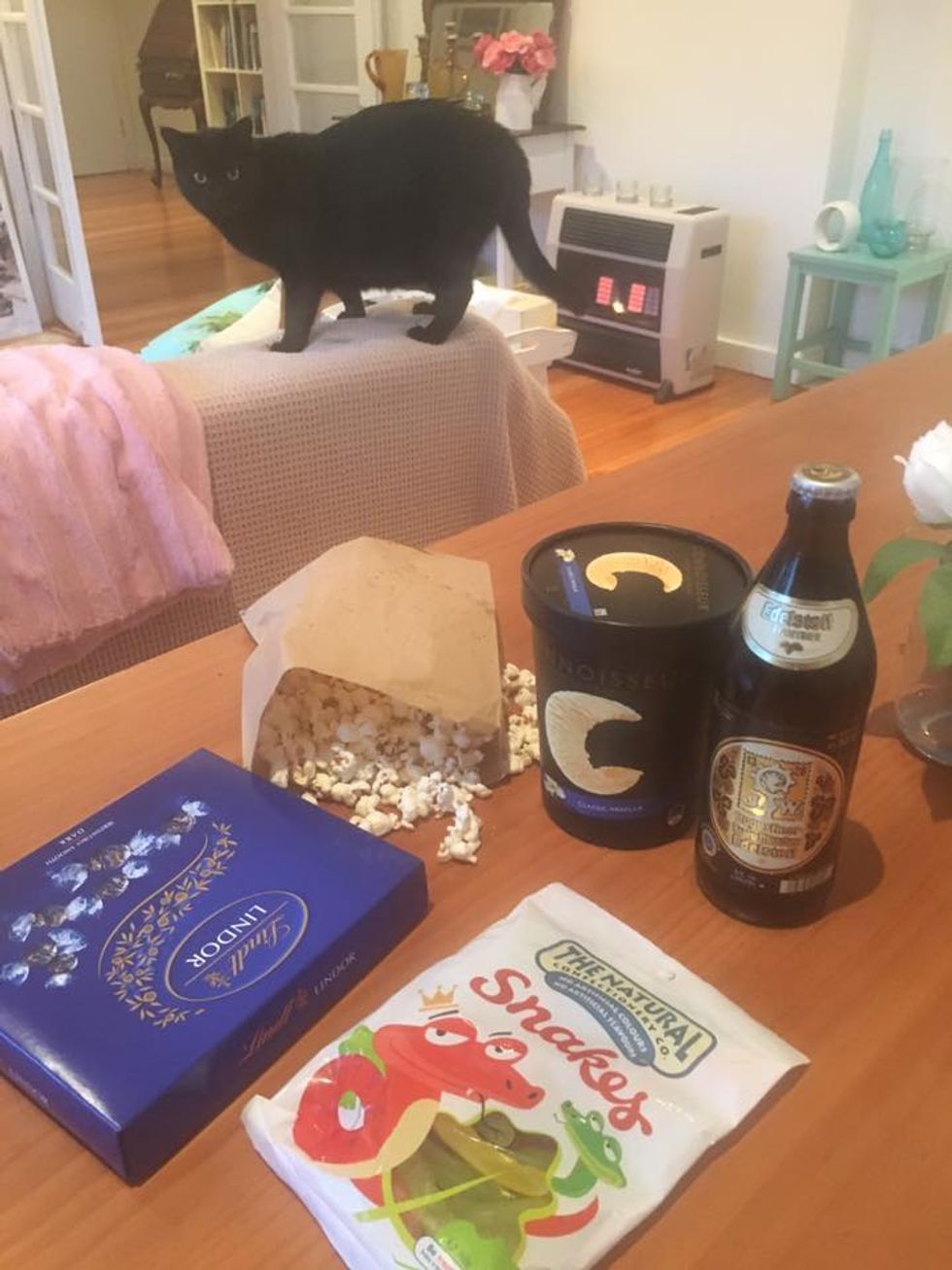 This means Kittie Smalls and I, in our last night of awkward reconnection thanks to sheer boredom, are planning a special party for tomorrow night! We've invited the love of our life, Brent Stephens, over to finally watch our new TV in glorious 4K Netflix. Look how 'excited' she is. Telstra Thanks!"