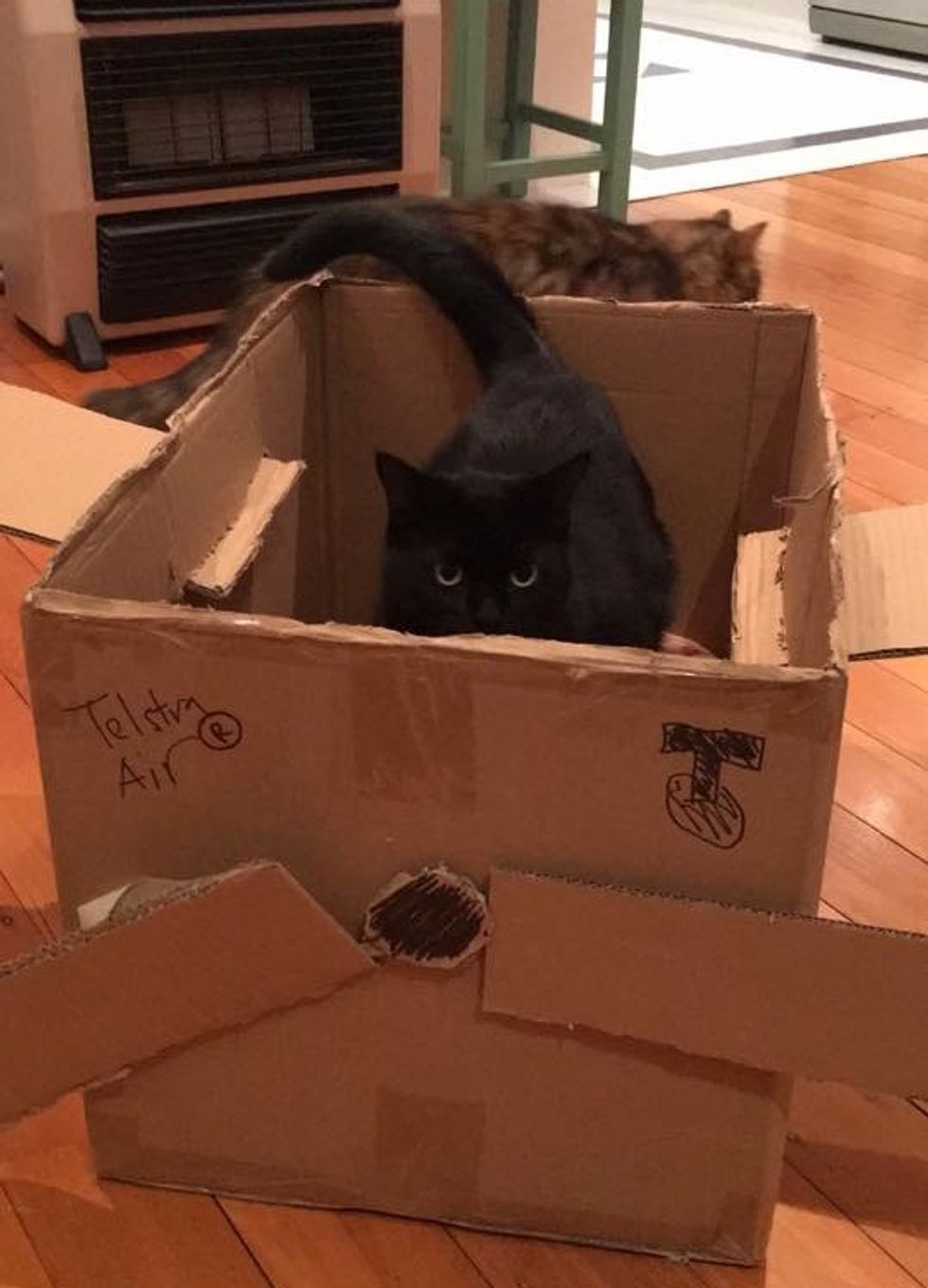 "Hey team Telstra! Day 7. No interwebs still. What to do, what to do.... Let's party old school style with a rousing game of hide and seek. Kittie Smalls is a master of camouflage!"