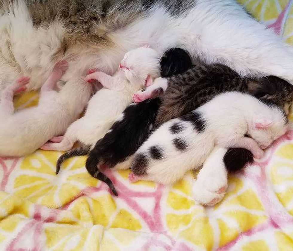Hoping to get the cat and her kittens the best care and good homes, Sandy reached out to Jen, a foster volunteer of Jin's Bottle Babies, for assistance. "She messaged asking what to do and the timing worked out pretty perfectly," Jen told Love Meow.