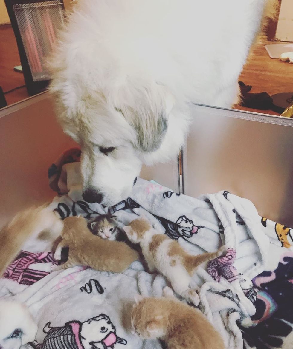 The gentle giant stays nearby, guarding the sweet feline family. He can't wait for the little ones to get bigger so he can help Mama Nancy kitten-sit them.