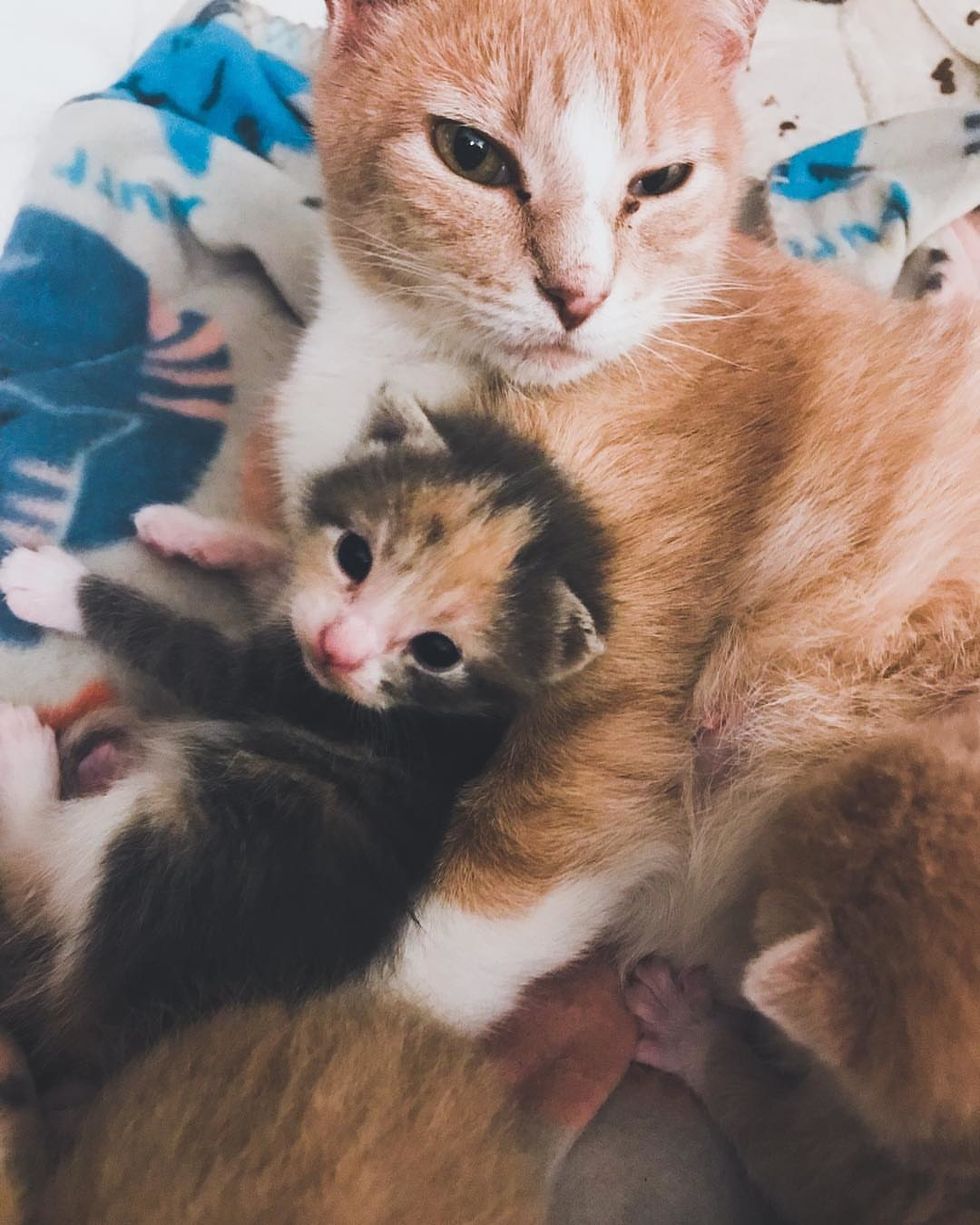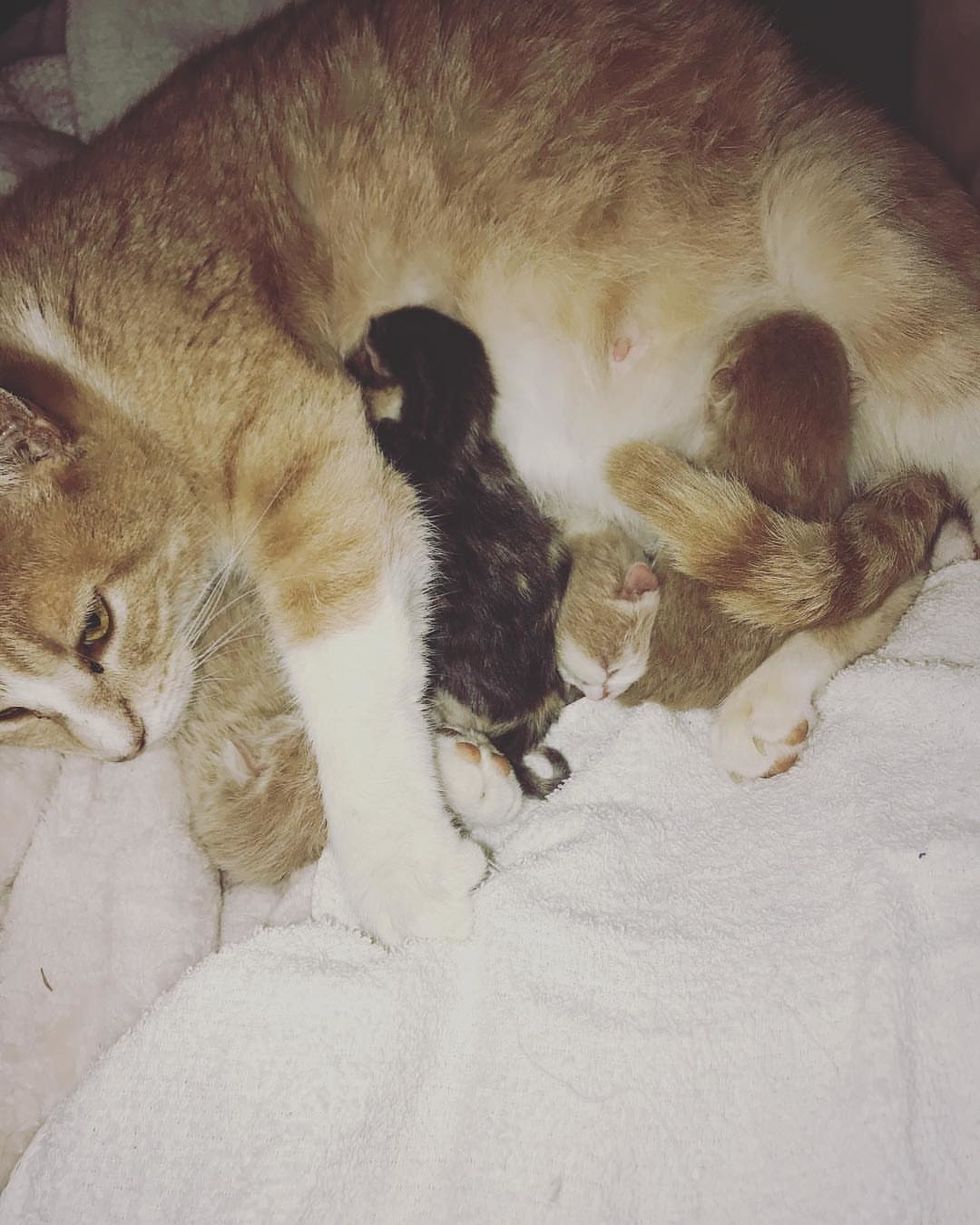 "She is always purring around her babies and keeps them so clean and well-fed. She is the best mom, incredibly attentive and loving."