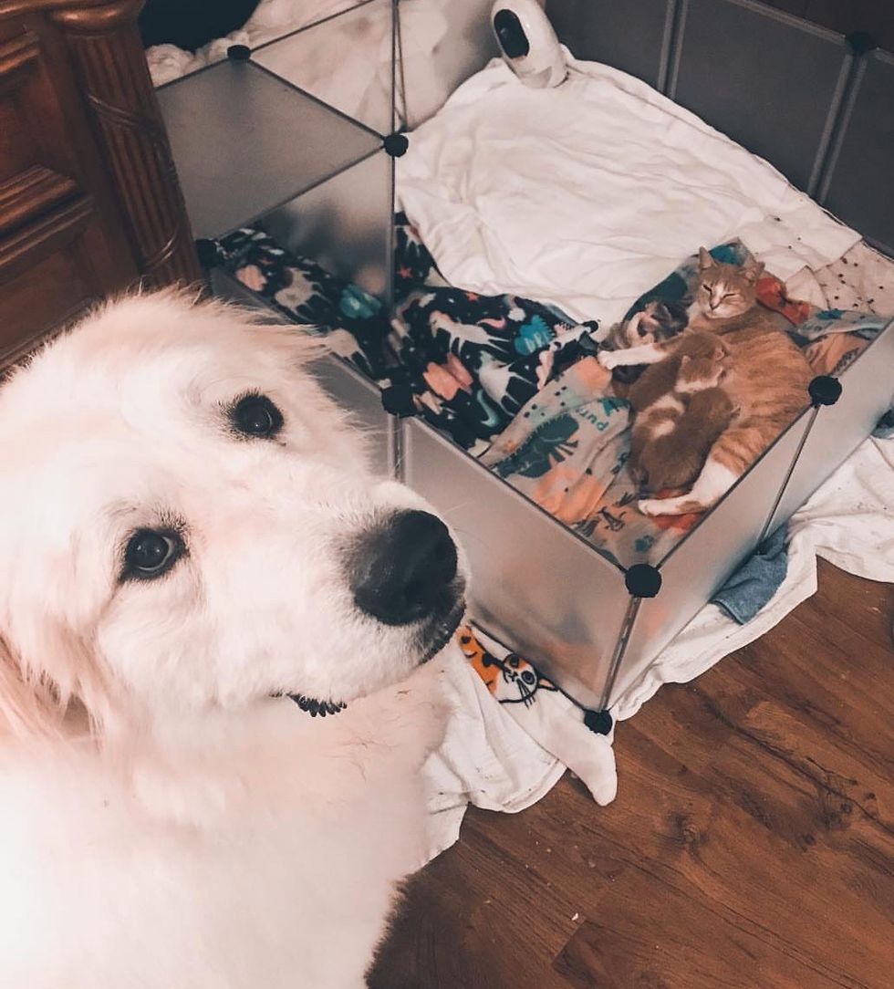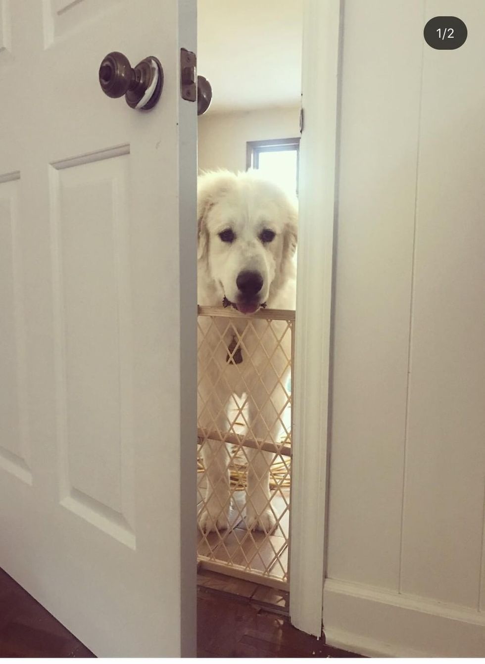 Katie's 14-month old Great Pyrenees, Burt, overheard the commotion from the kitten nursery. He immediately came by the door to look.