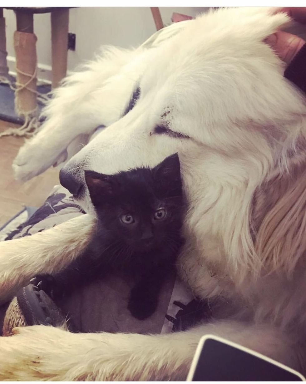Burt gave the kittens a few licks as if to welcome them into their loving home.