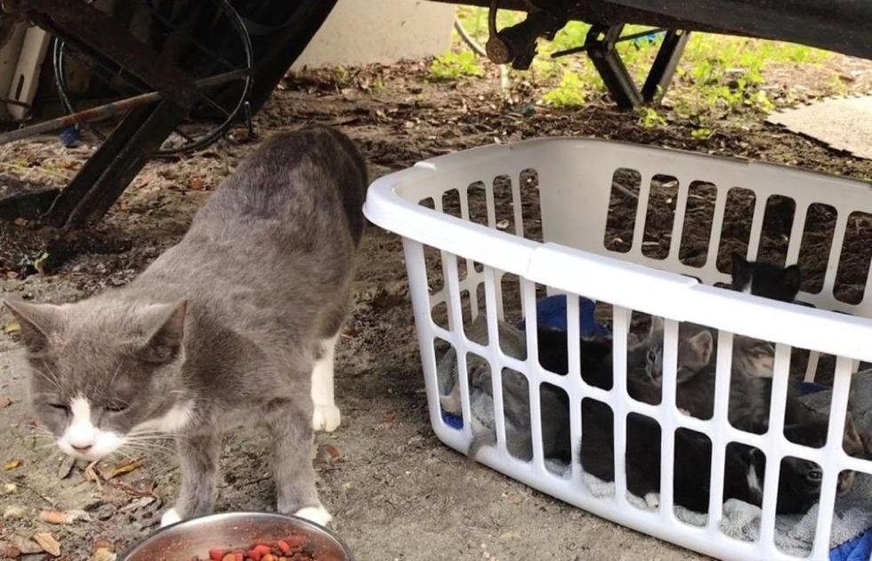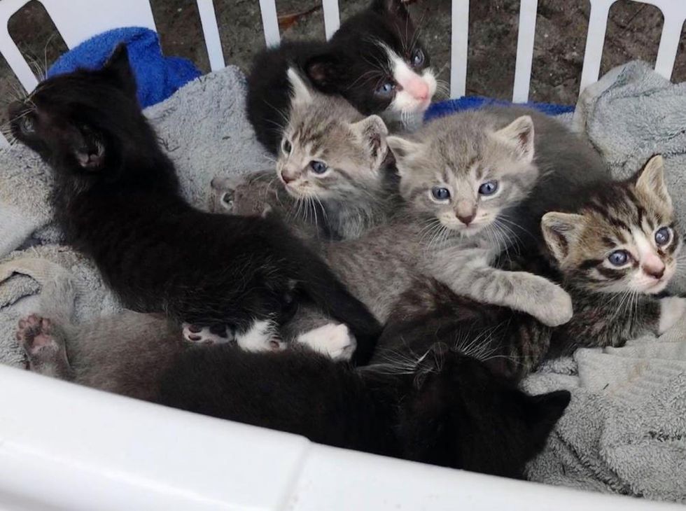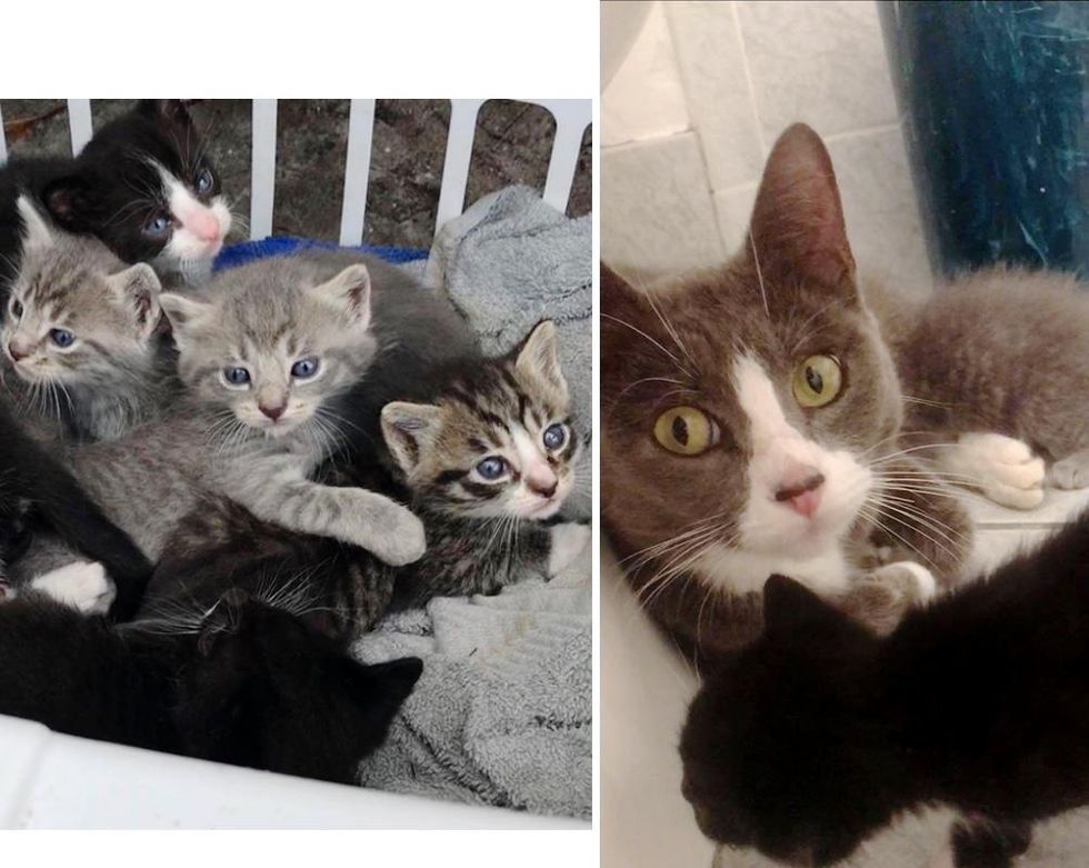 Carmen rushed to the area to check on the family of eight. When she arrived, she was met with a friendly momma cat and a basket of very demanding kittens.