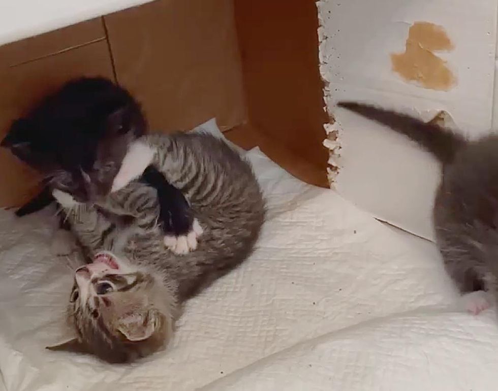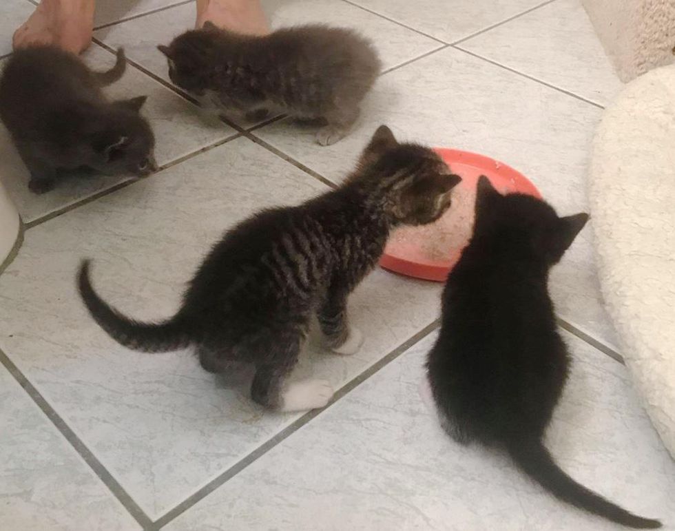The kittens were a bit skinny despite their mom's best efforts to keep them fed. They immediately dove into the wet food and started eating, which was a good sign.