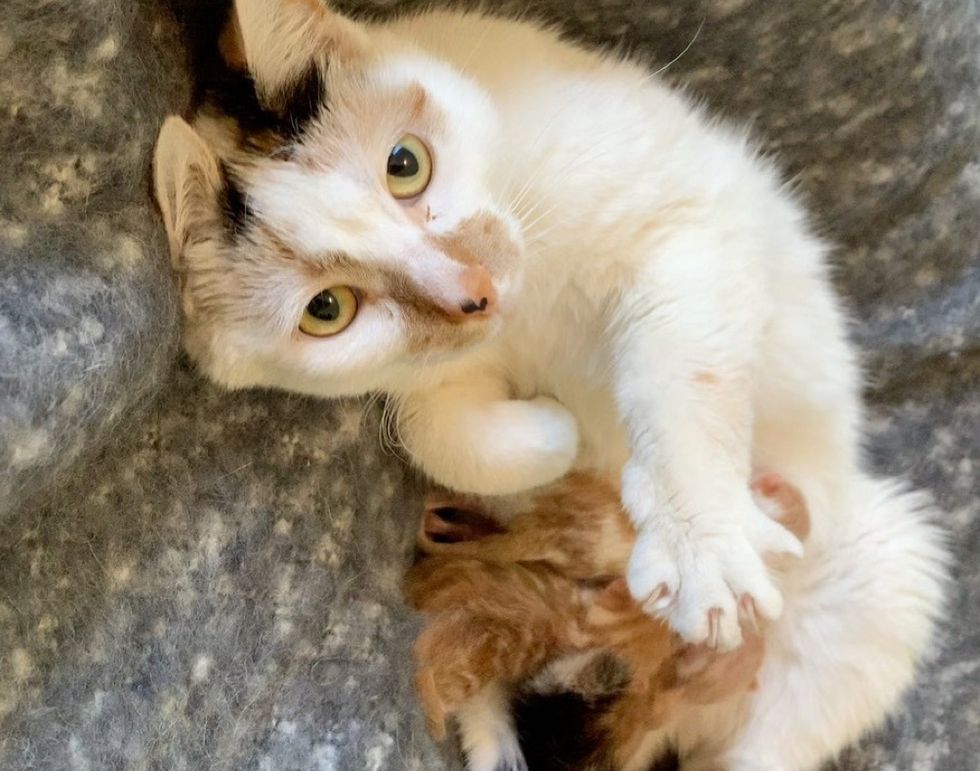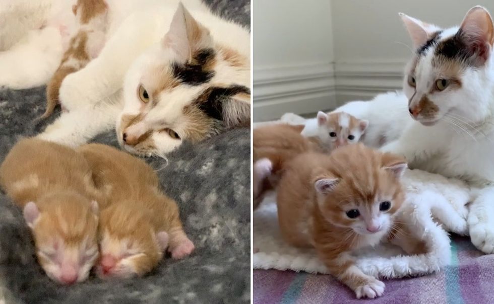 They thought there would be another few weeks until the tiny babies arrived, but a few days later, Amber walked into the room to quite the surprise — the sweet cat mom, Pandora, gave birth to a litter of four kittens.