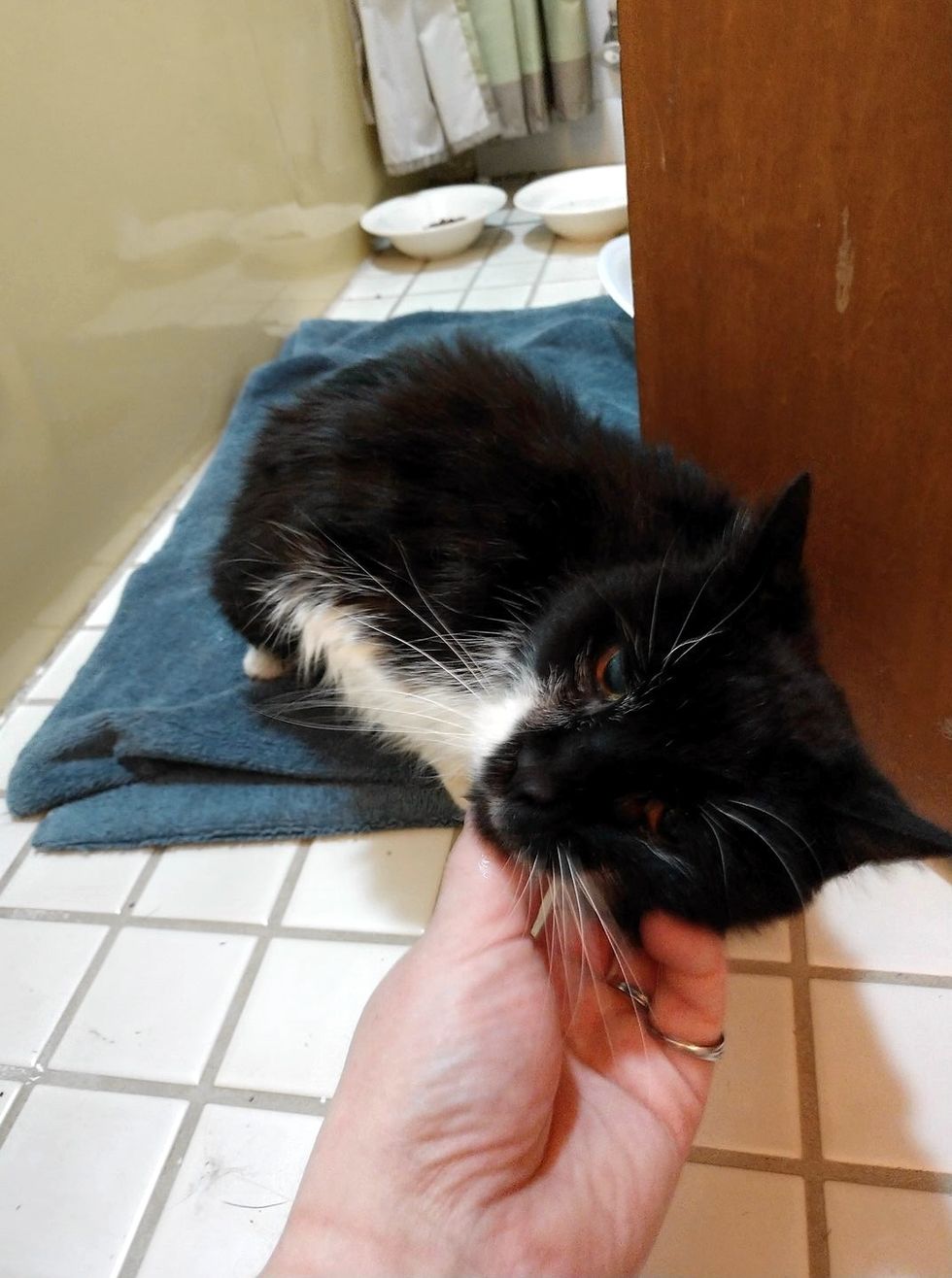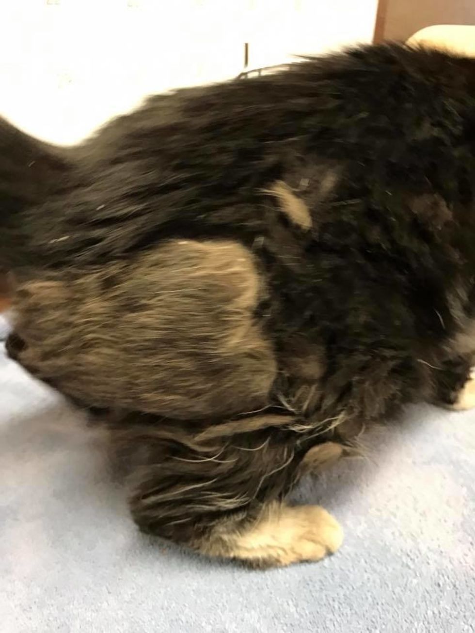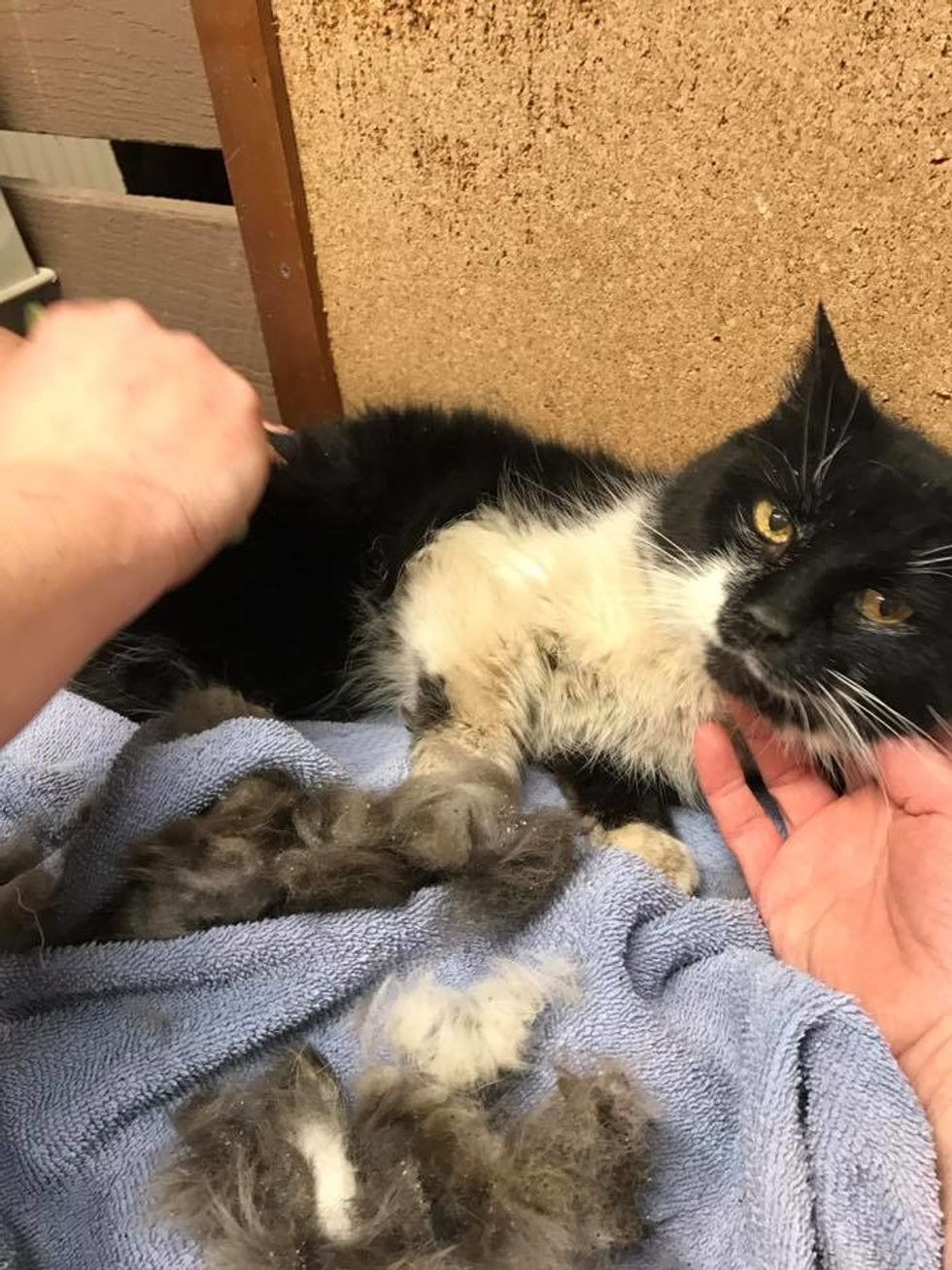 While getting the knots and mats removed, Mila was gratefully purring and rubbing her face on the staff.