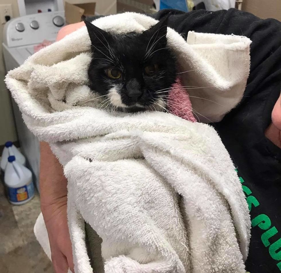 After getting her cleaned up and trimming the ingrown nails, Mila snuggled comfortably wrapped in a purrito, purring nonstop.