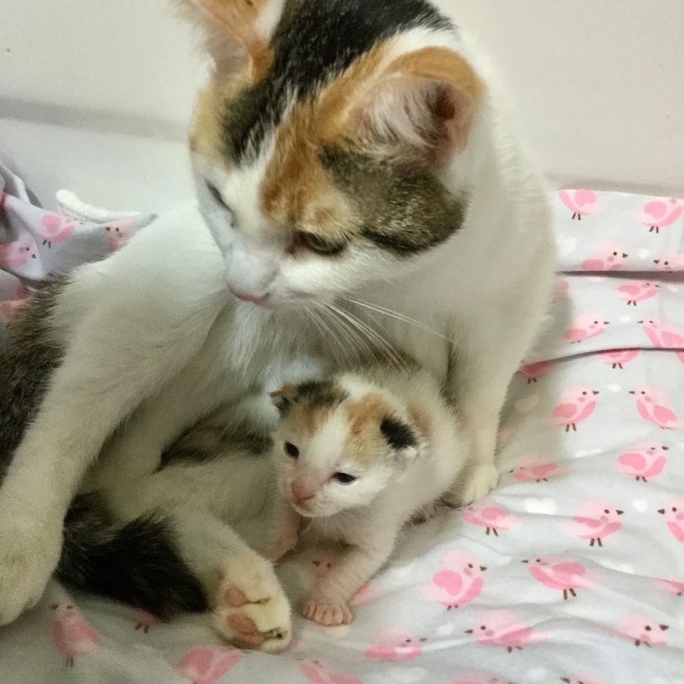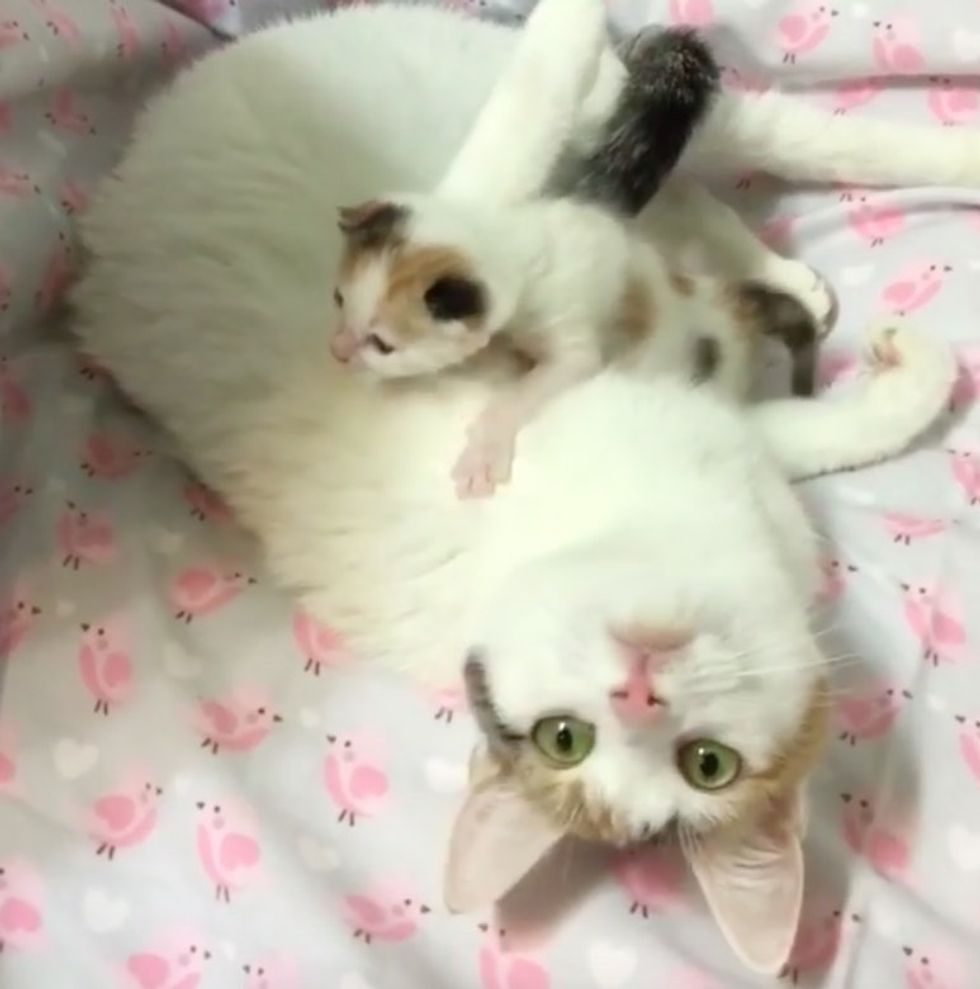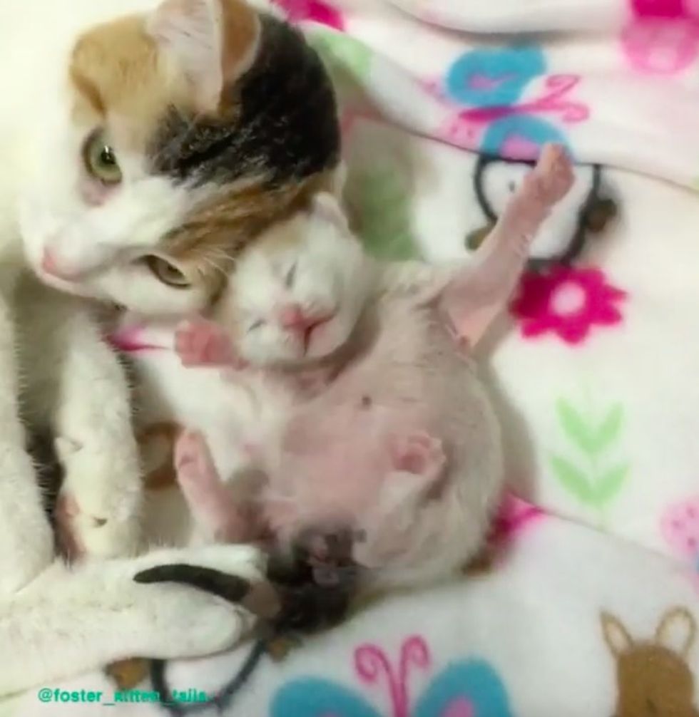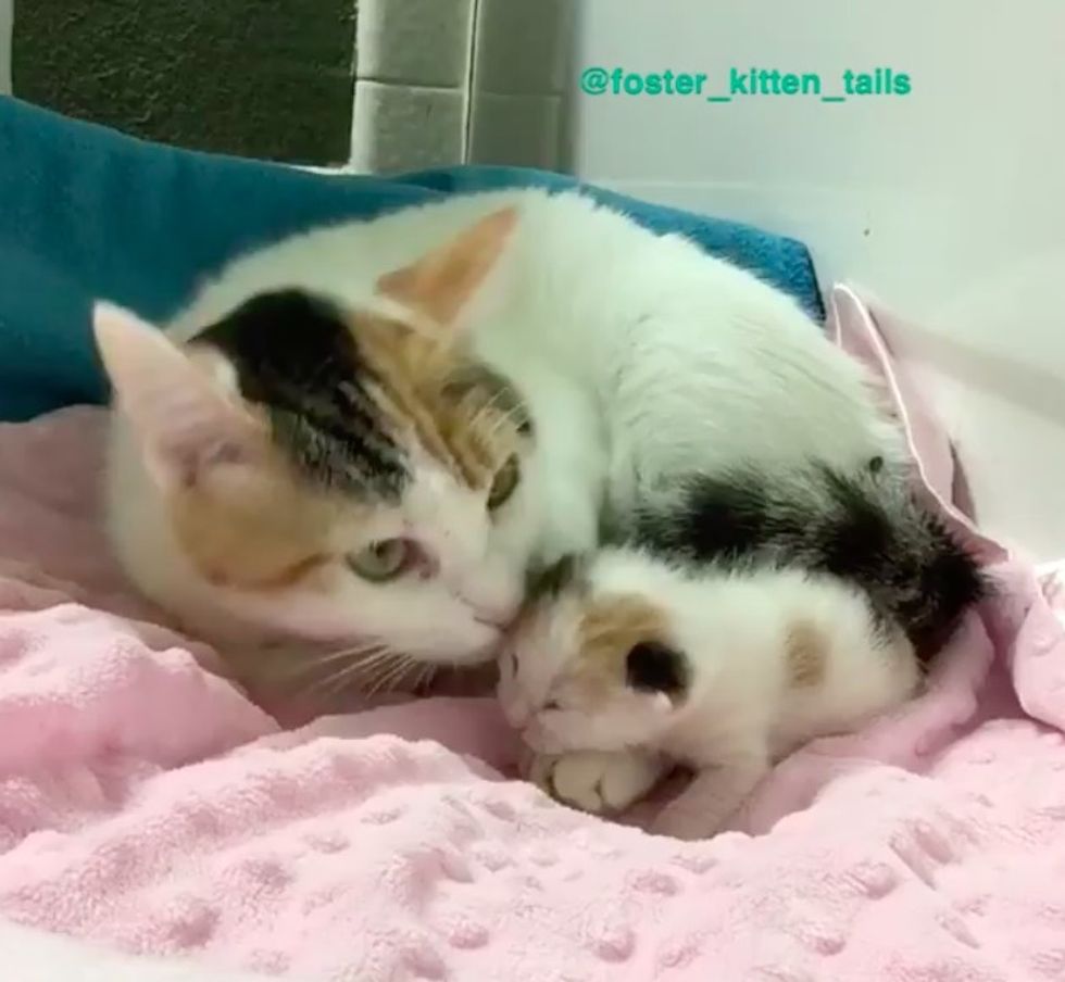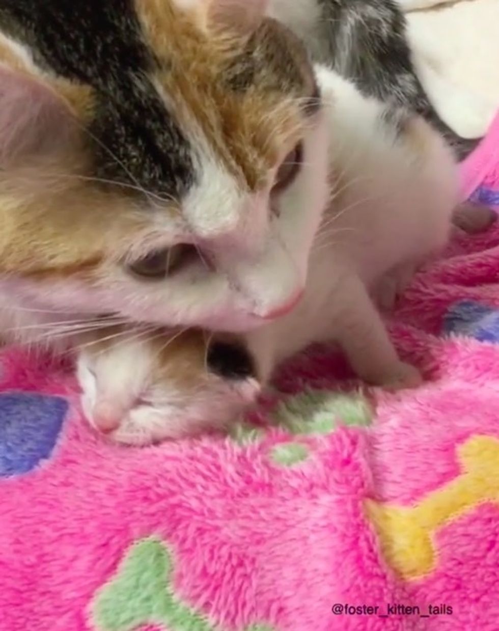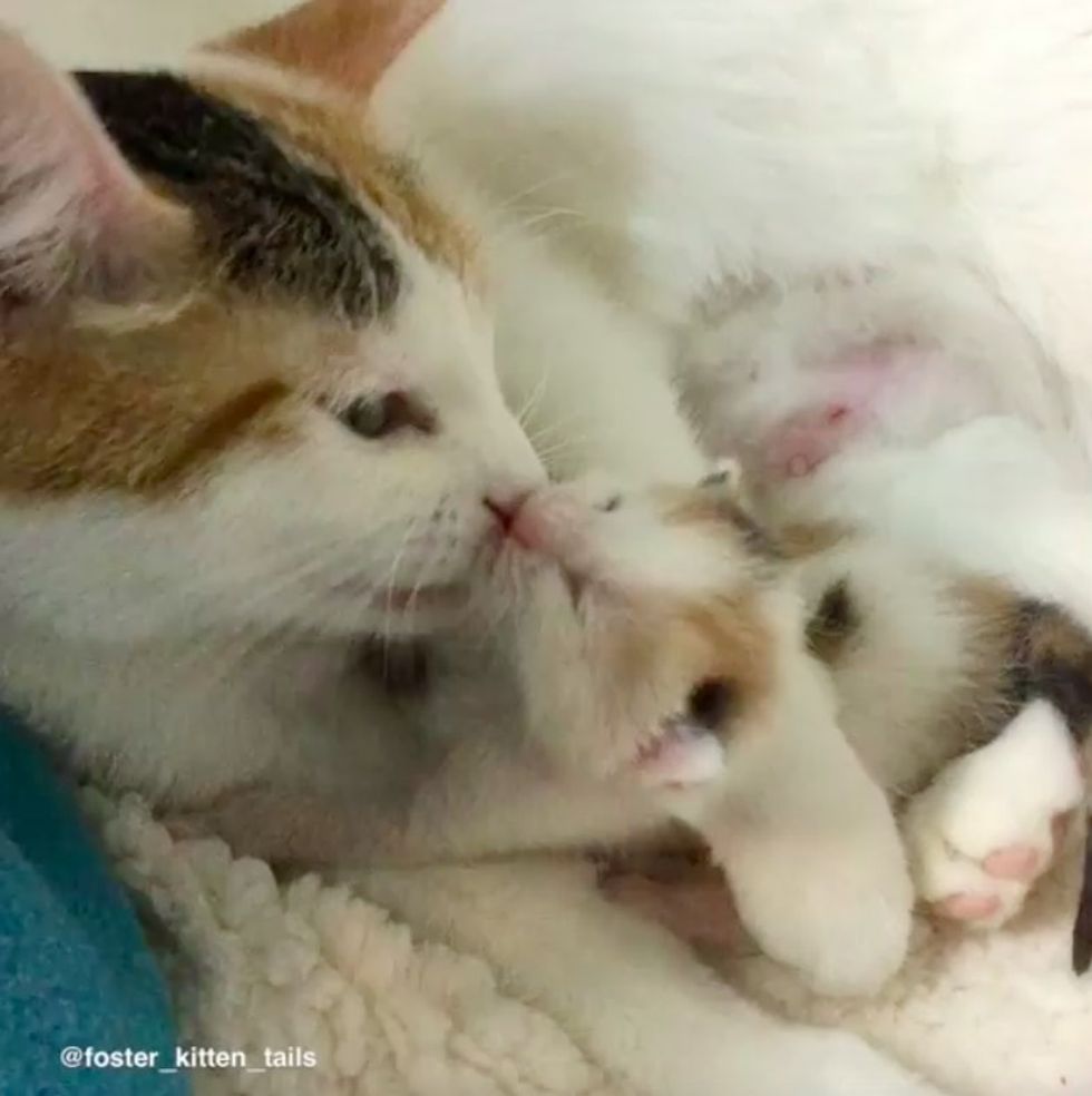 Harmony had no idea how to nurse or what to do. Ellen Richter, an avid foster carer, started guiding her how to care for her baby. "I taught her how to nurse, lay on her back, but all she wanted to do was 'hug' the baby," Ellen told Love Meow.