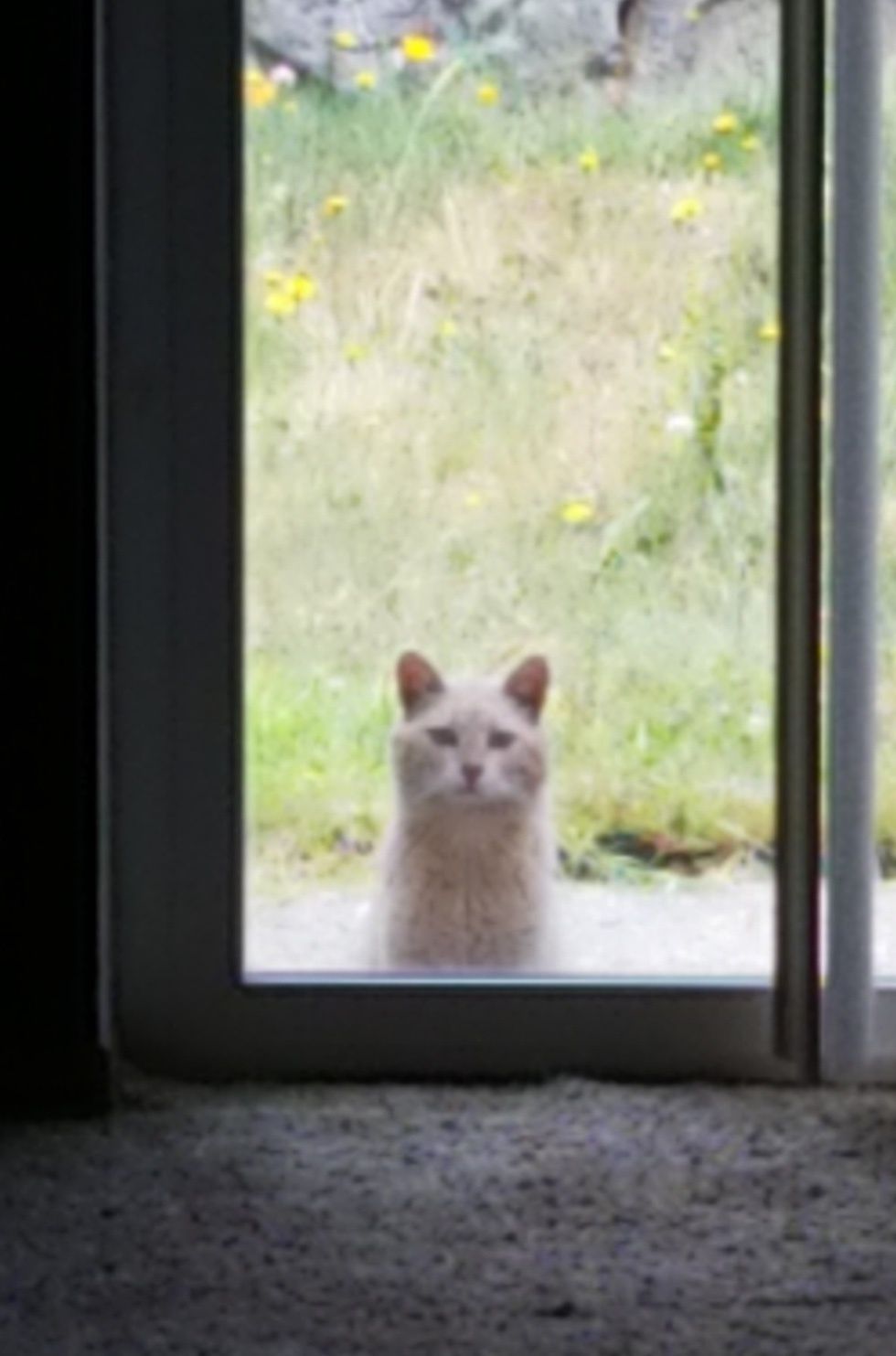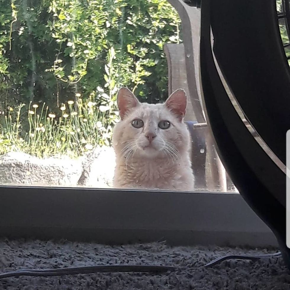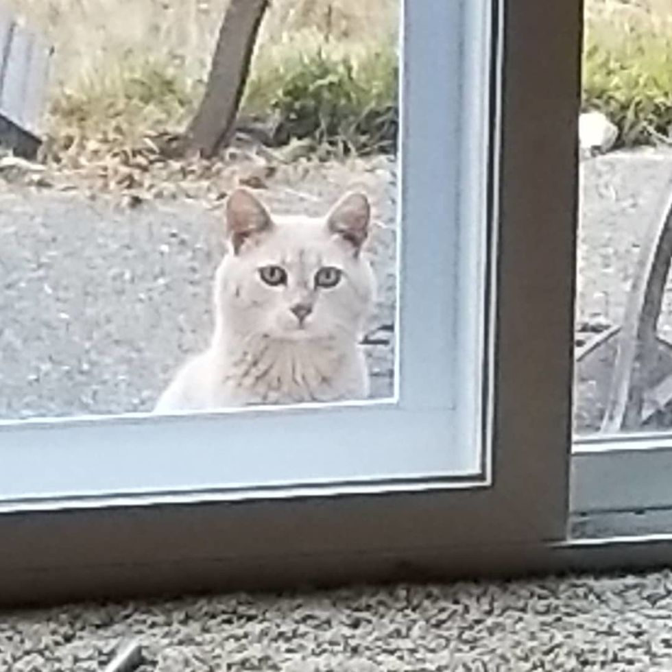 By the time they finished reading the note, lo and behold, the said cat was right there peeking through the glass door, ready for some snacks.