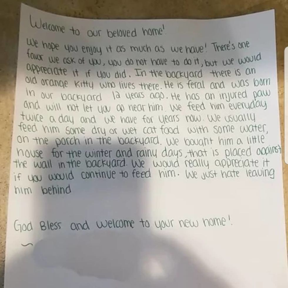 "There's one favor we ask of you… In the backyard there is an old orange kitty who lives there… He has an injured paw and will not let you go near him. We feed him everyday twice a day and we have for years now," they wrote on the note. "We bought him a little house for the winter and rainy days, that is placed against the wall in the backyard."
