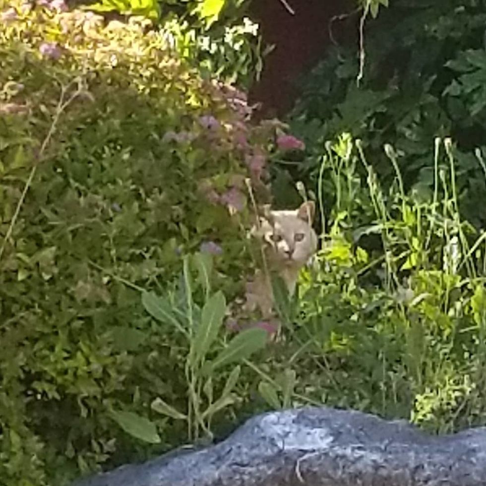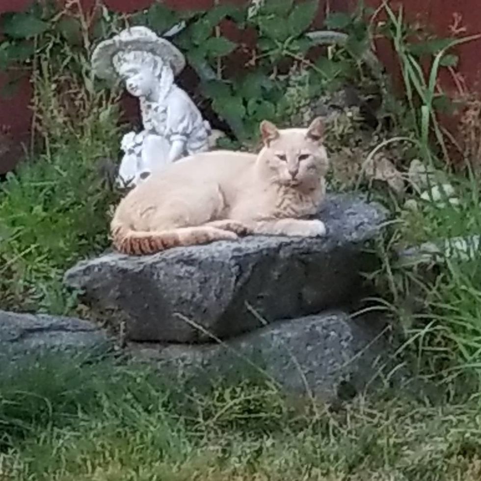 The kitty has a rock in the backyard that he claims as his throne, and if he wants a change, he will hop on one of the chairs outside to chill and relax.