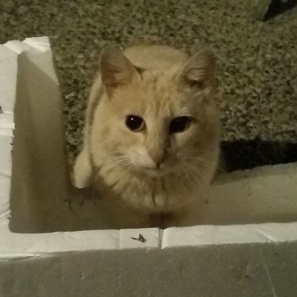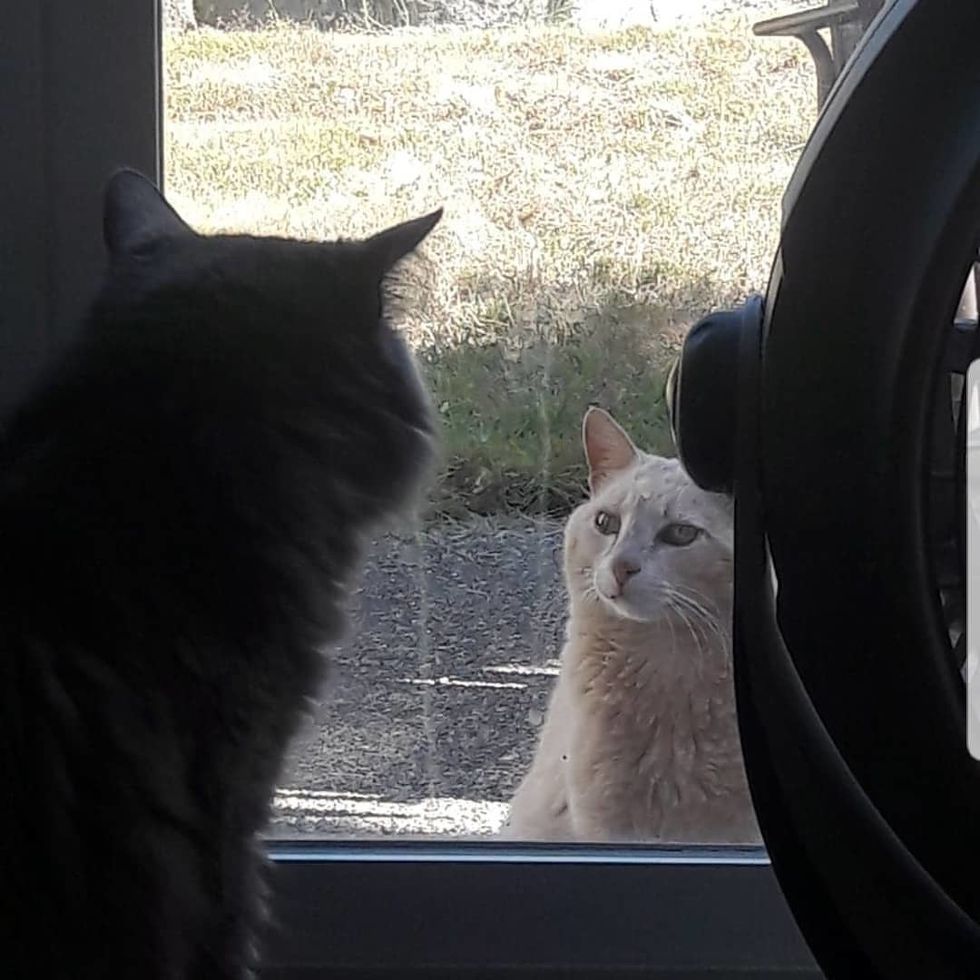 "He's met all of the other cats through a screen door and they're very friendly to each other. There's been no growling or hissing, and they mostly touch noses and smell each other through the door."