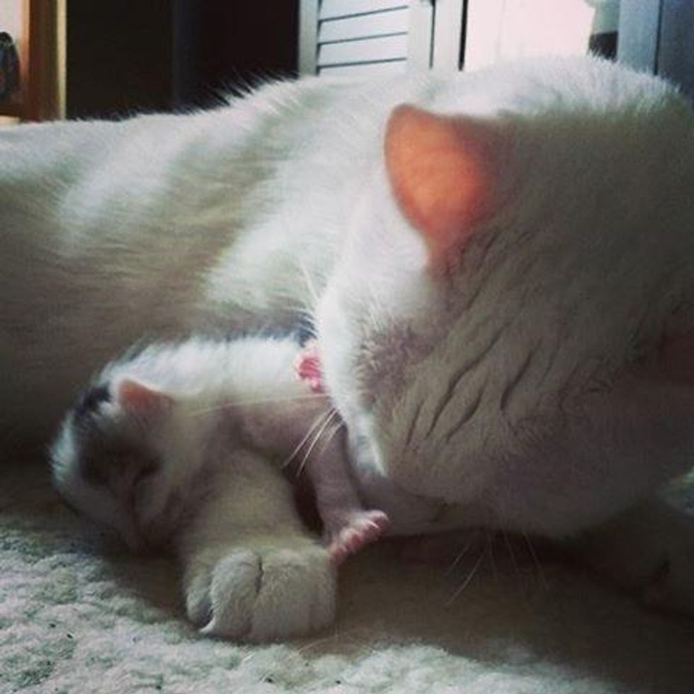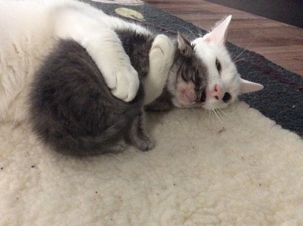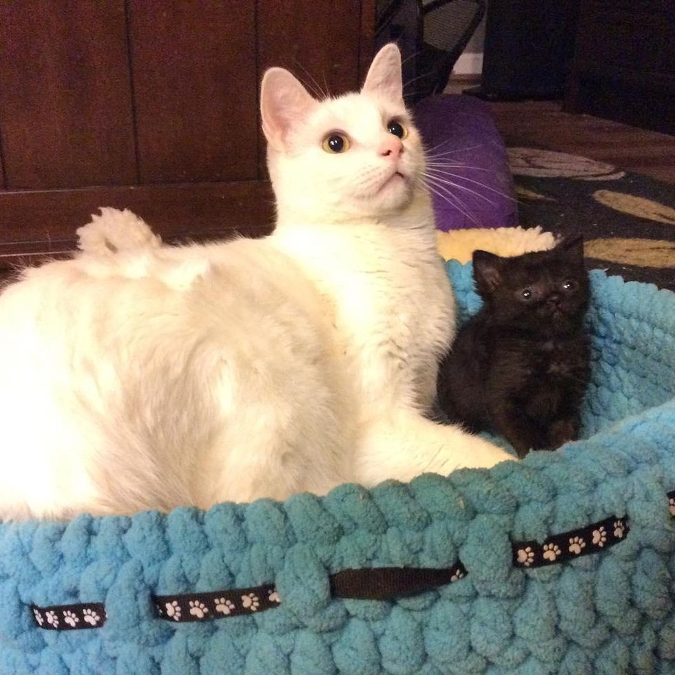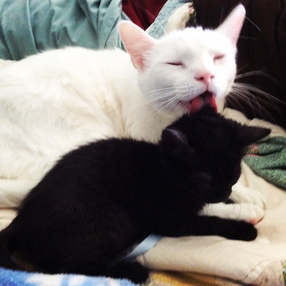 Benny adored Winifred, a tiny miracle kitten who was rejected by her mom. Benny took to her and showered her with love and baths.