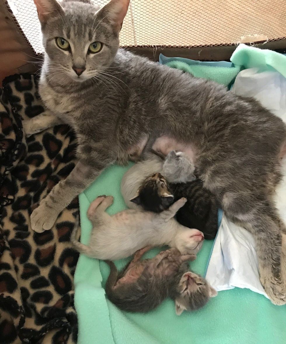 Trixie was taken to a local shelter. When she was in labor, she was not aware of it because she can't feel below the waist. Sadly, two kittens didn't make it. Shelter staff immediately sent her to a veterinarian who delivered the other four kittens via a C-section.