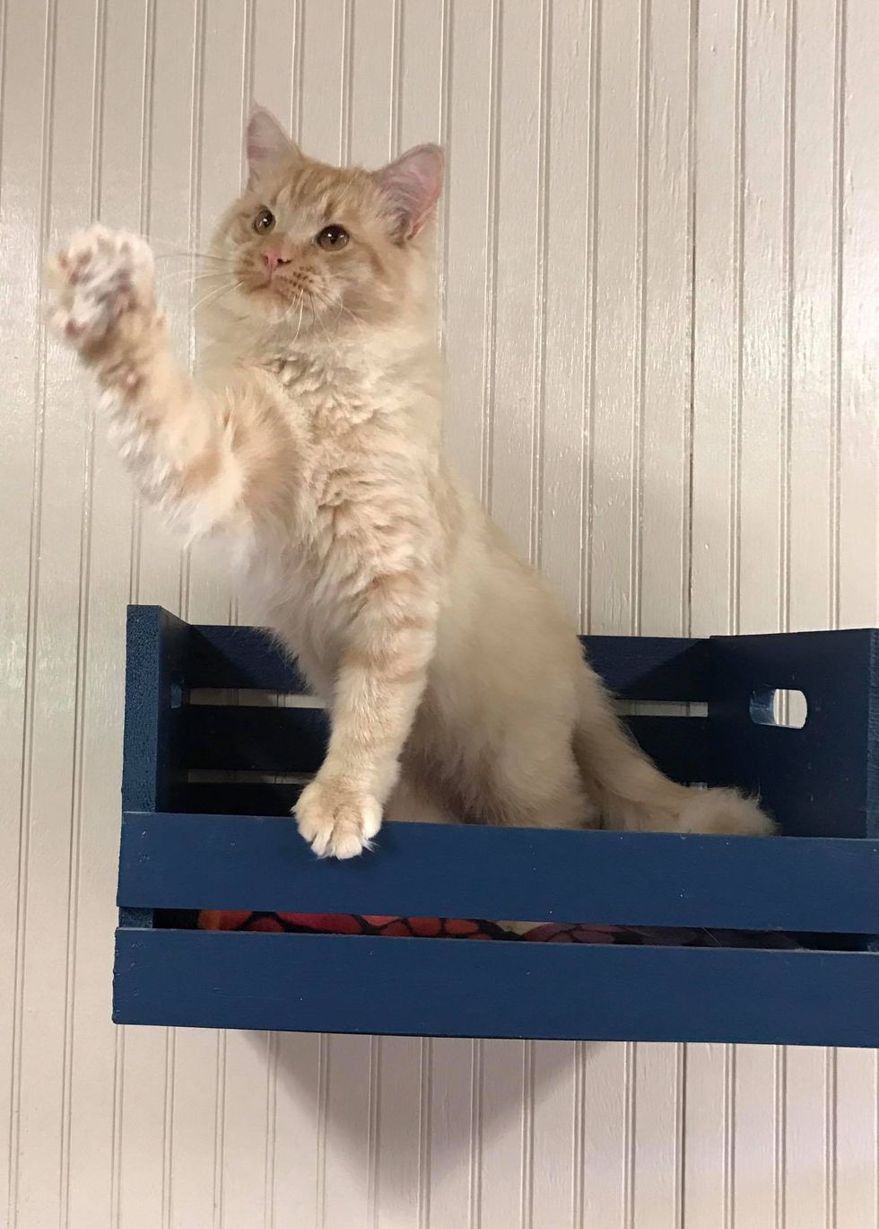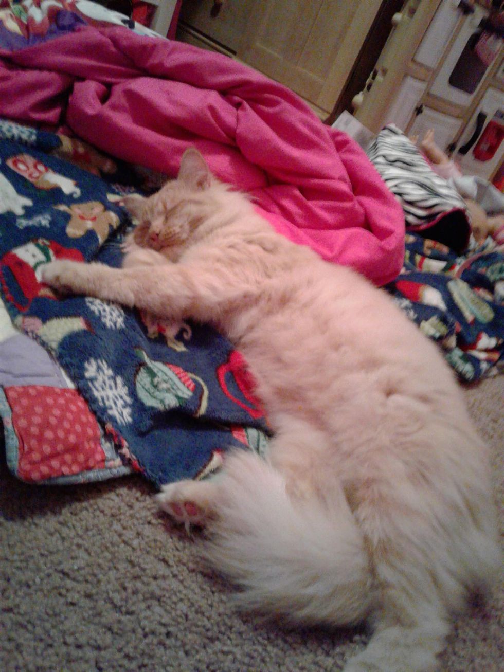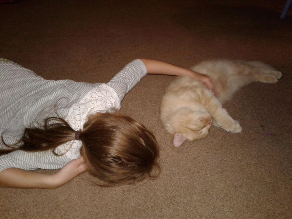 "He will flop down on the ground if you're simply just touching his head so that you will rub his belly. He also has a very unique meow. He squeaks!"
