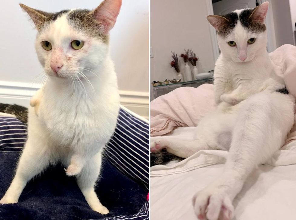 A cat with stubby front paws hopped his way into the hearts of so many after life on the streets.