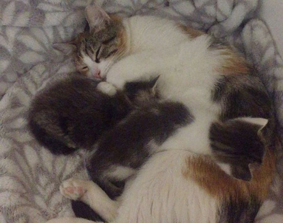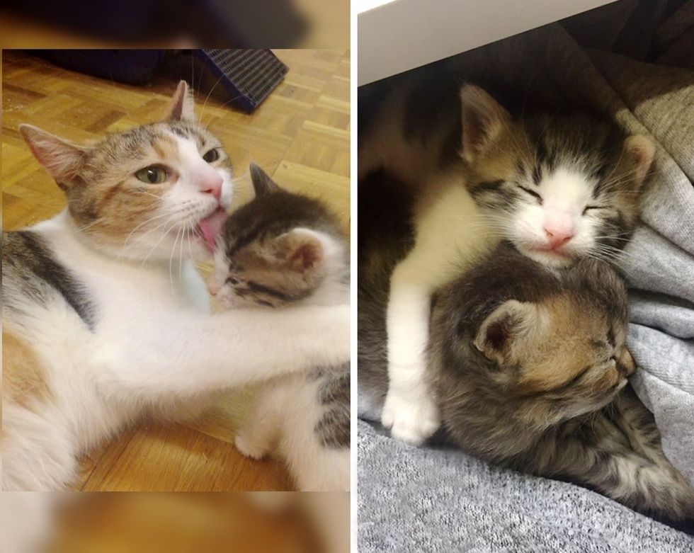 Despite not having much milk, Primrose let her adopted kittens nurse on her for hours on end. The four little nuggets happily kneaded on her belly while they soaked up the love.