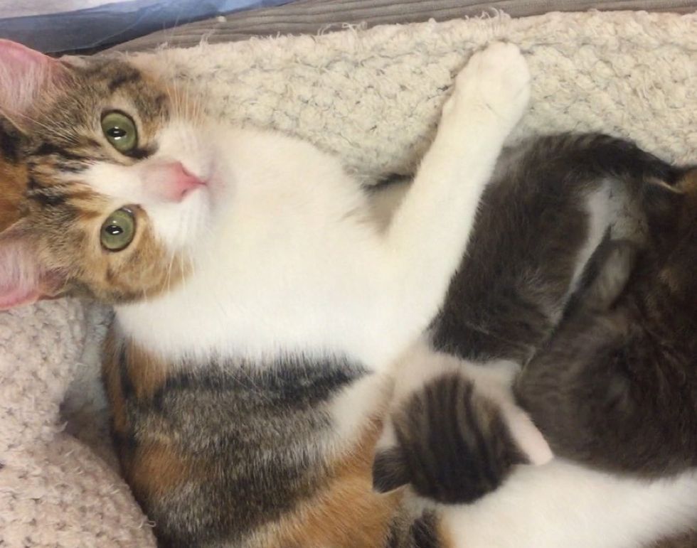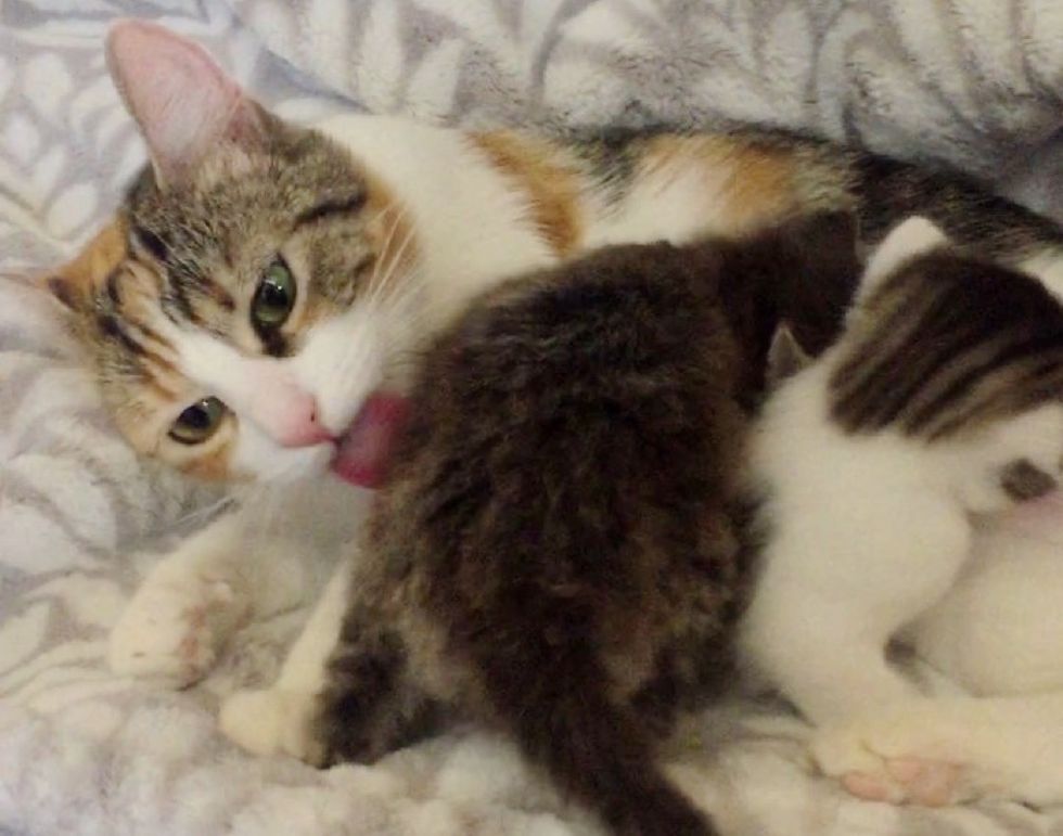 The cat named Primrose felt right at home and purred up a storm when she arrived. She nestled in her new bed with her kittens and started grooming them. The sweet mom was thrilled to get some attention and pets from her caretaker.