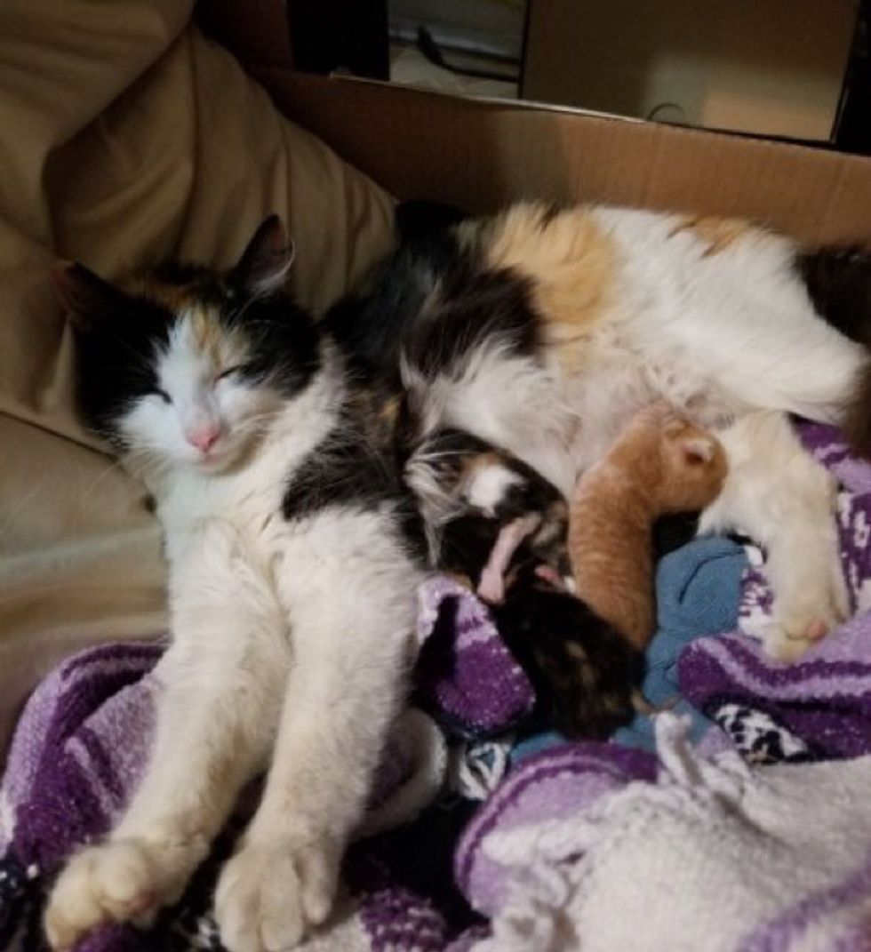 Around that time, Linda noticed the cat had a belly bump — Callie was pregnant. She tried to coax her into her home and set up a birthing box for the expectant cat mom. Callie showed up one Sunday, but quickly left.