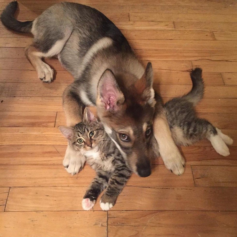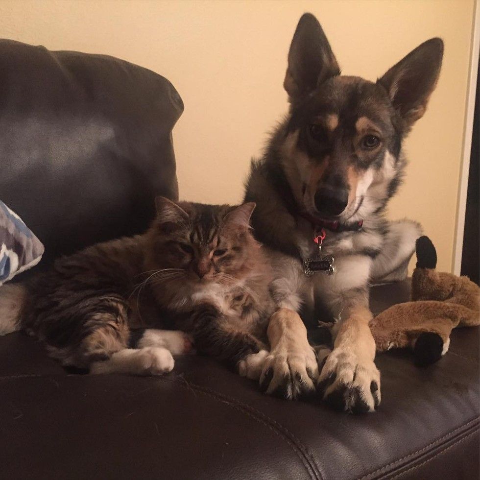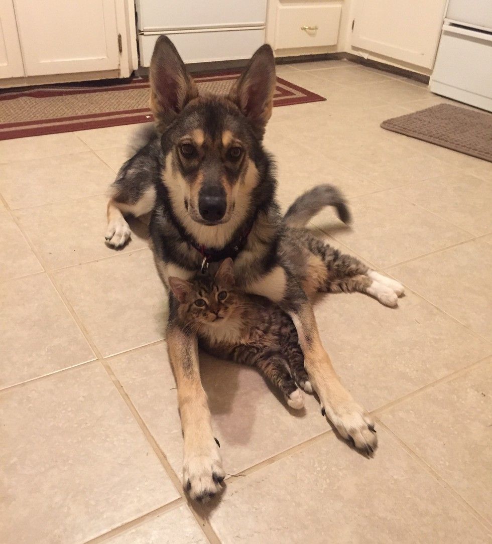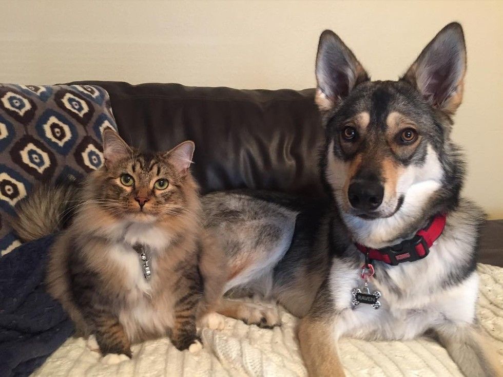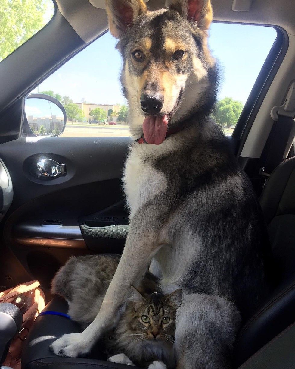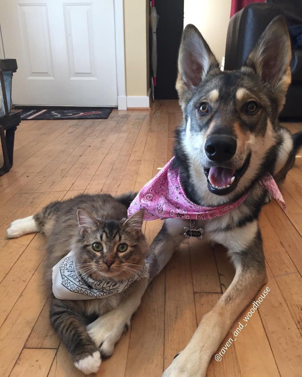 Raven the Tamaskan took Woodhouse the tabby cat out of the shelter and into their loving home.