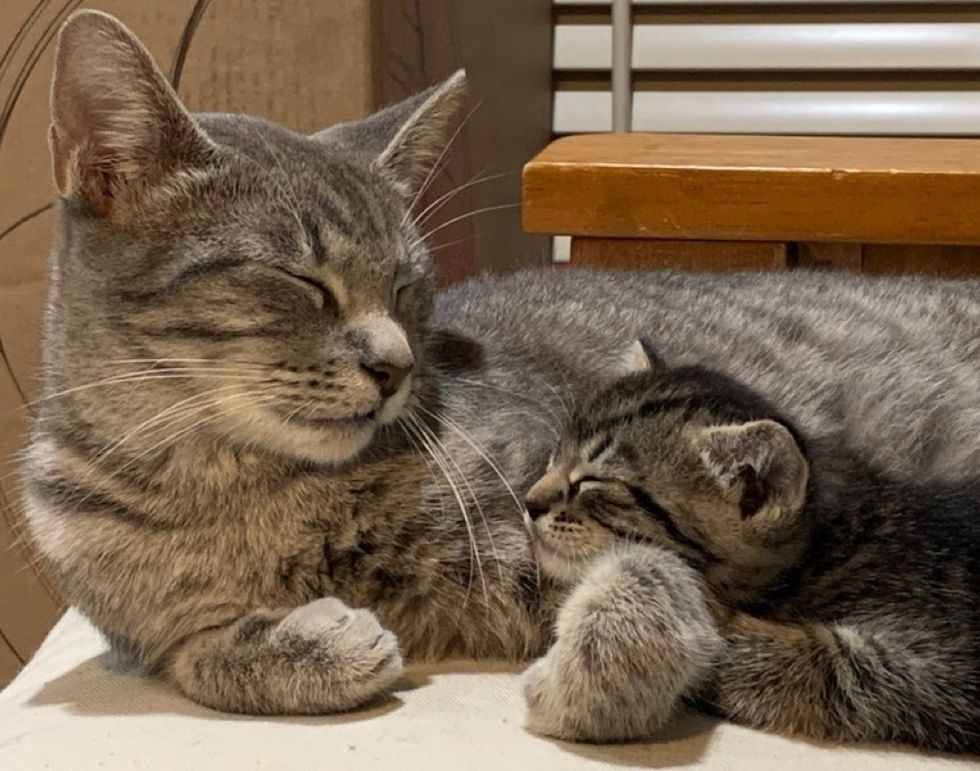 The loving cat mom and her little mini-me enjoy snuggling with each other in their cozy "cave", falling asleep together.