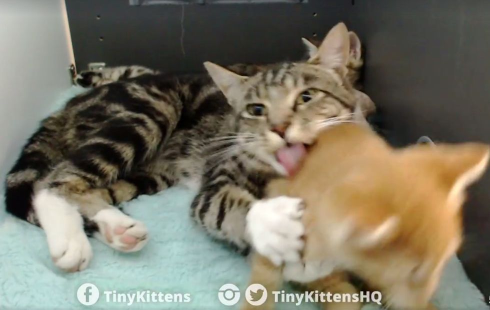 They placed them in foster care and soon noticed that one of the tomcats displayed strong parental instinct to some of the kittens. Not only did he start grooming them, but he also let them "nurse".