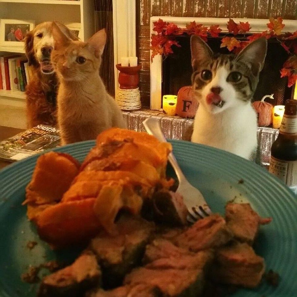 Every time Stevie has dinner, his three furry companions stare at his plate until the last bit is gone.