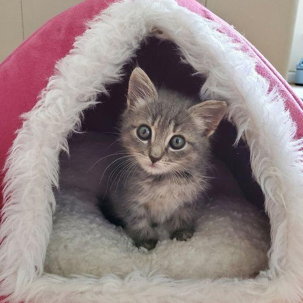 A tabby kitten found herself in a shelter in Central Valley, California, in need of rescue. She was brought in as a stray with a broken pelvis. Despite being unable to walk, the kitten was determined to change that.