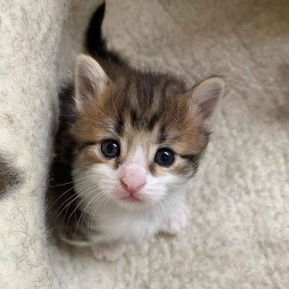 The kitten is unapologetically determined to do everything just like her siblings. As soon as her litter mates began to venture out of the nest, she insisted on following suit. Despite being a bit slower on her feet, nothing could stop her.