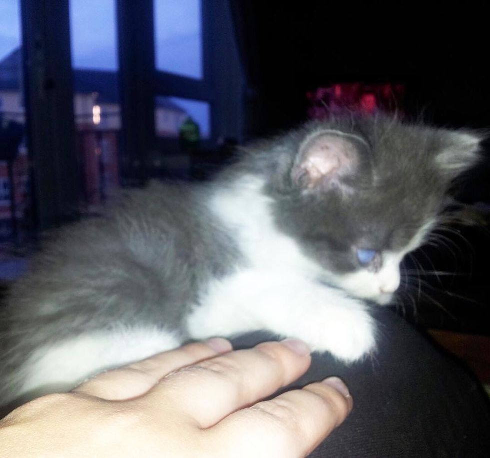 The kitty was born blind with patellar luxation and skeletal abnormalities. "When I first picked him up, he kind of just curled up into a ball in my hand. And then I stroked his head and he relaxed."