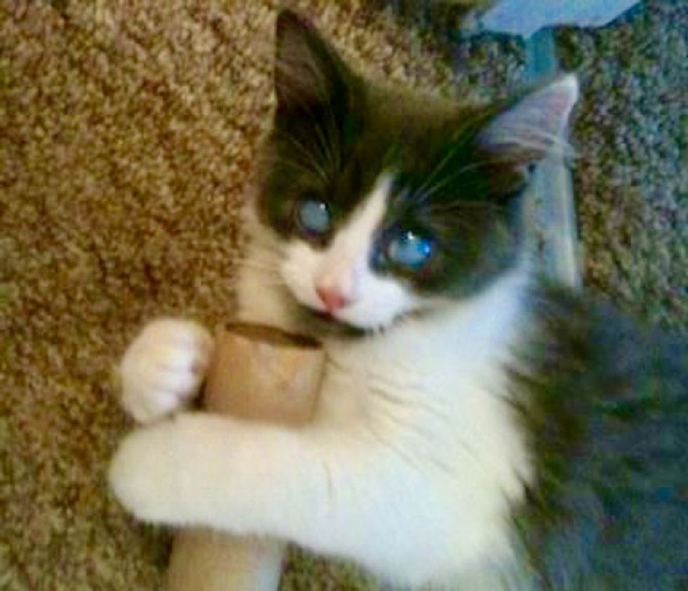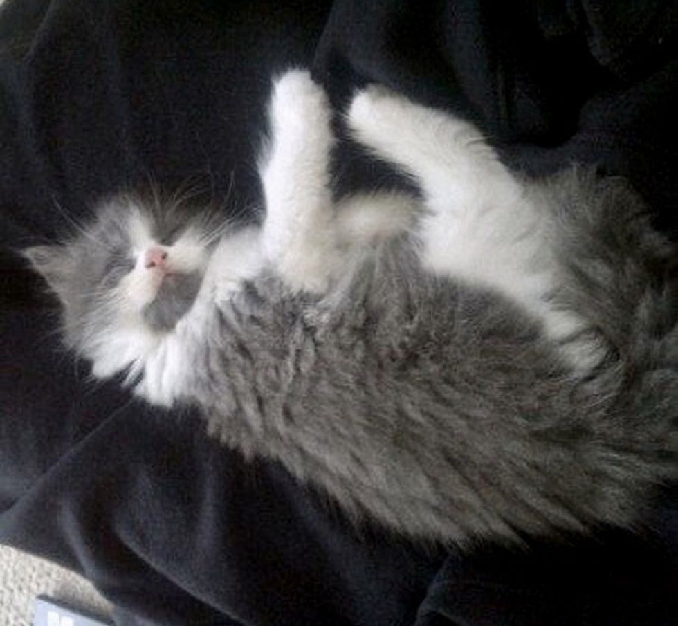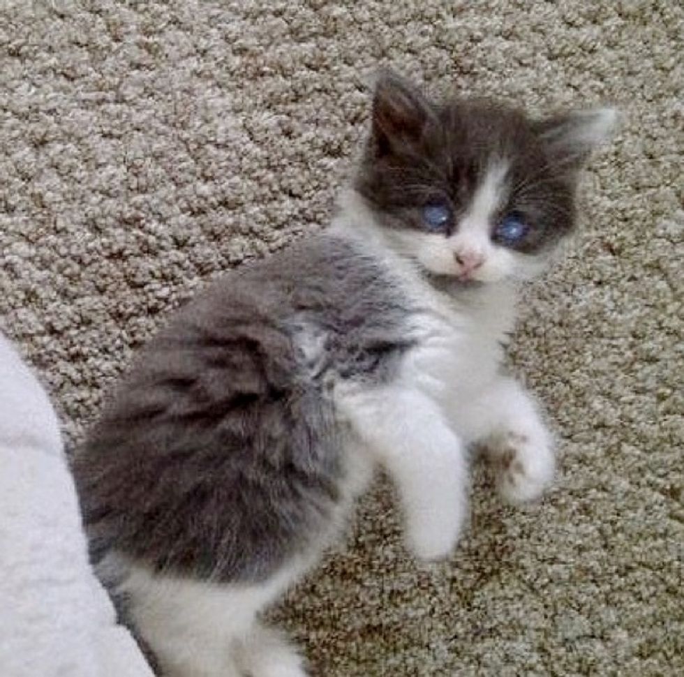 Soon after she arrived, she noticed a tiny gray and white kitten singled out by himself, nesting alone on top of a laundry basket. "He'd been rejected by his mama, and his litter mates had pushed him out," Kerry told Love Meow.