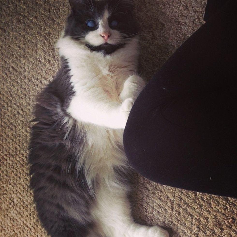 "He purrs a lot and is very specific with cuddles. He will lie between my legs when I'm in bed."