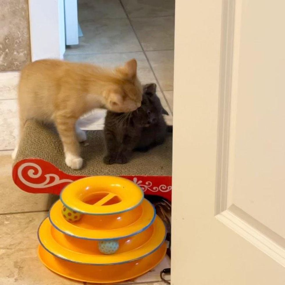 Around that time, an orange kitten named Rowan was in need of a buddy. His stay in foster care was extended when his adoption fell through. Once Tucker was medically clear, the two boys had a meet-and-greet.
