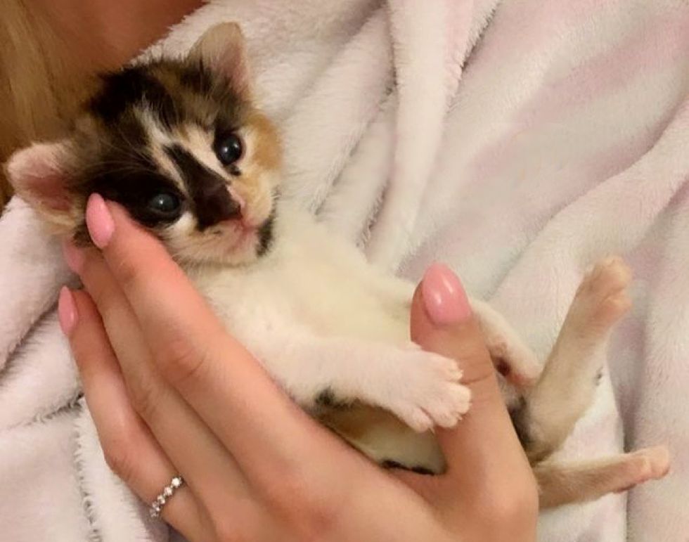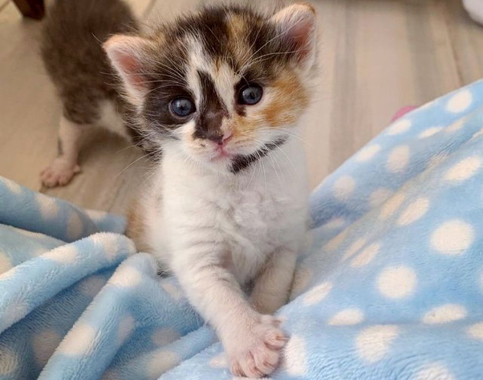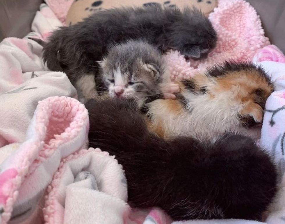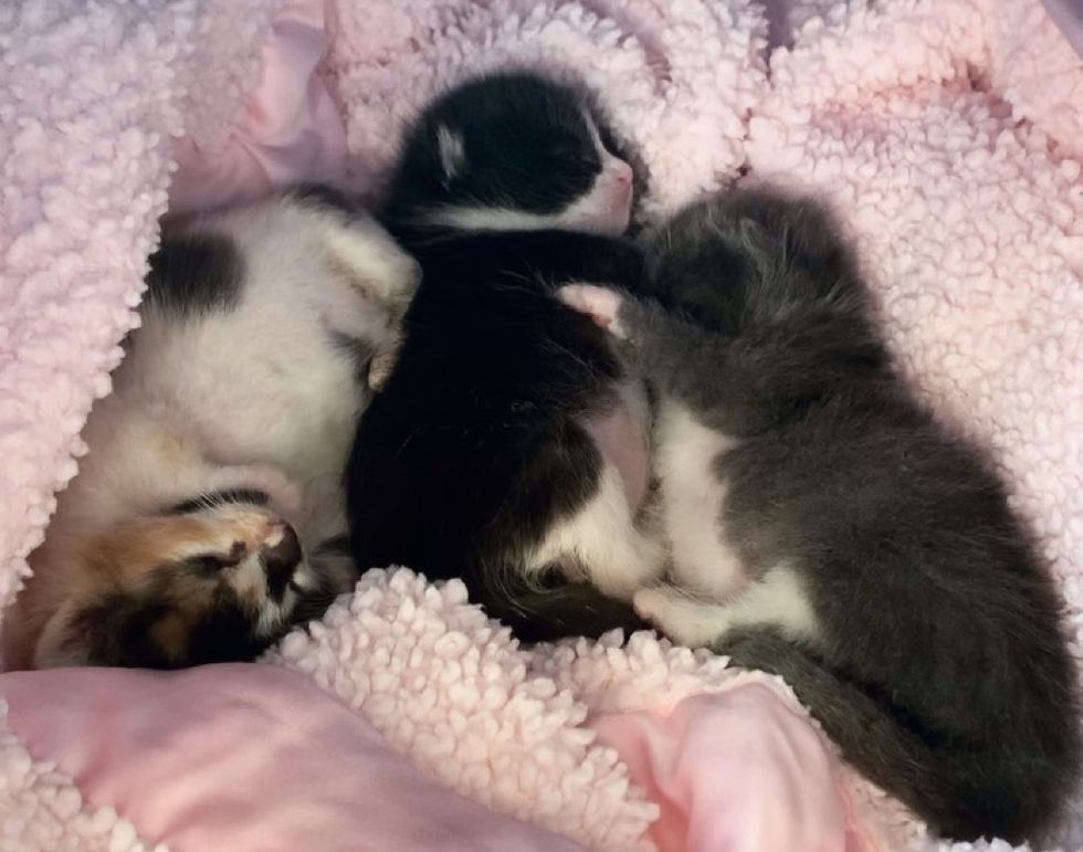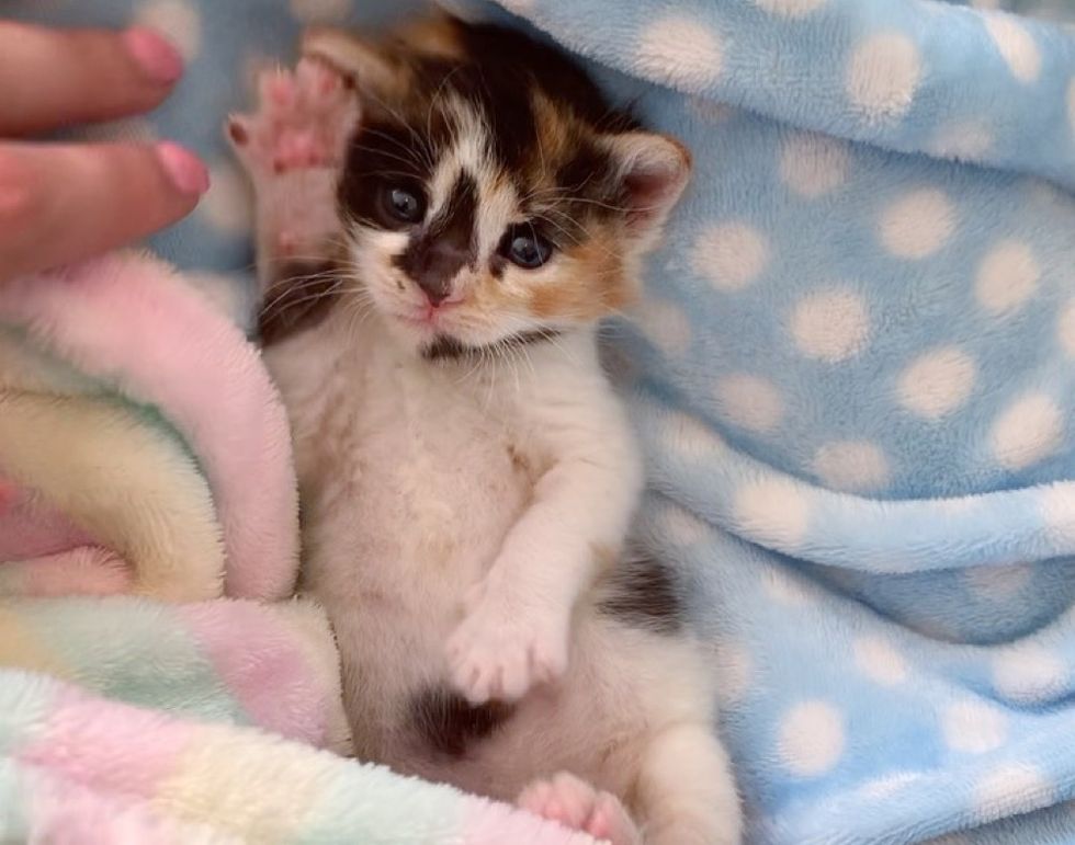 A calico kitten was found alongside her three brothers and rescued just in time.