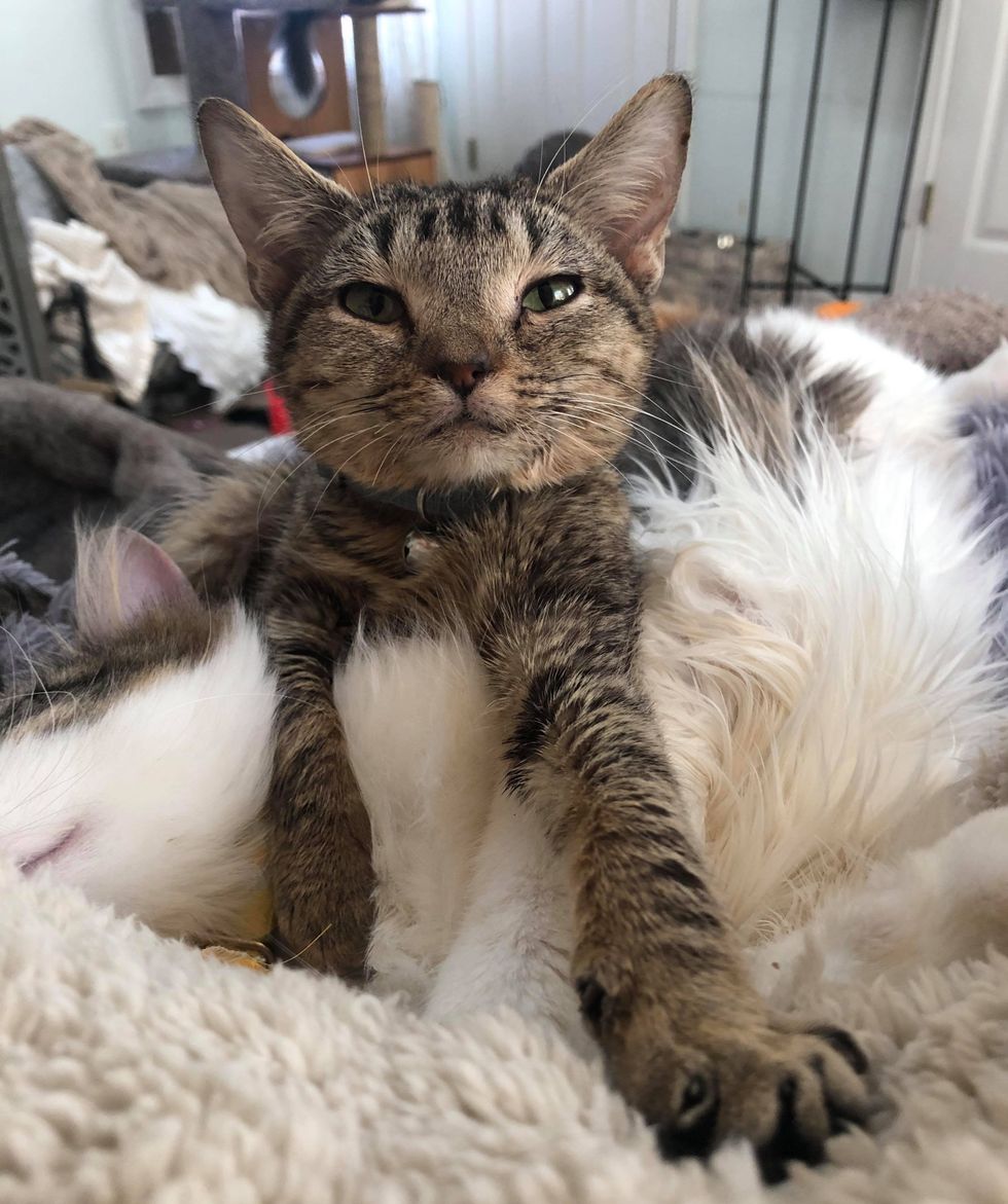 August the cat has Cerebellar Hypoplasia and wobbles when he walks. Tennessee spends a lot of time with him when he's resting so he won't be alone.