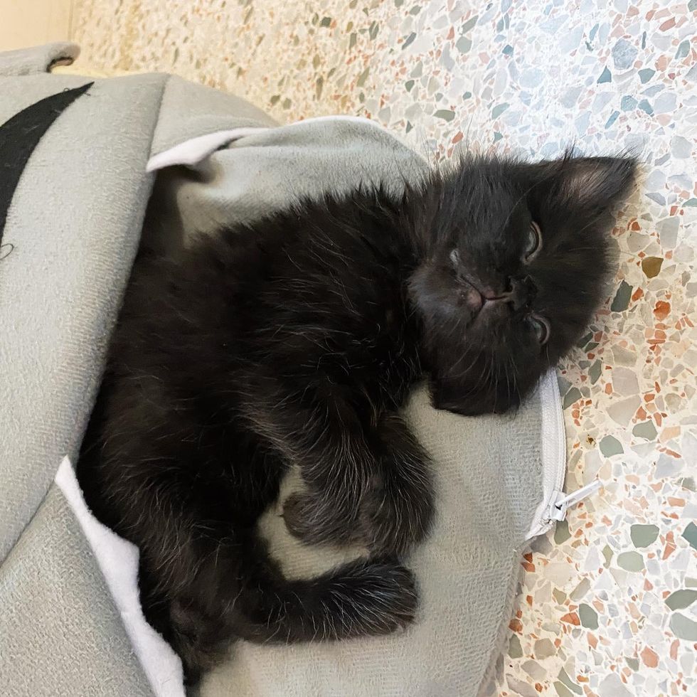 The tiny singleton was "found covered in ants inside a turned-over cooler" on the ground. She was meowing for her mother who was nowhere to be found.
