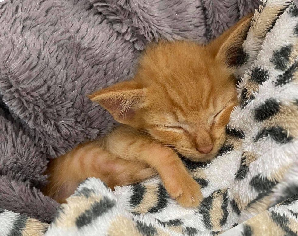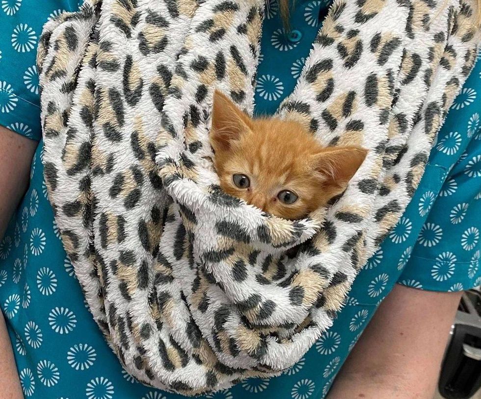 The vet nurse took him home to foster so the kitten could receive the care he needed to thrive. She brought him to work every day to keep up with the round-the-clock feedings.