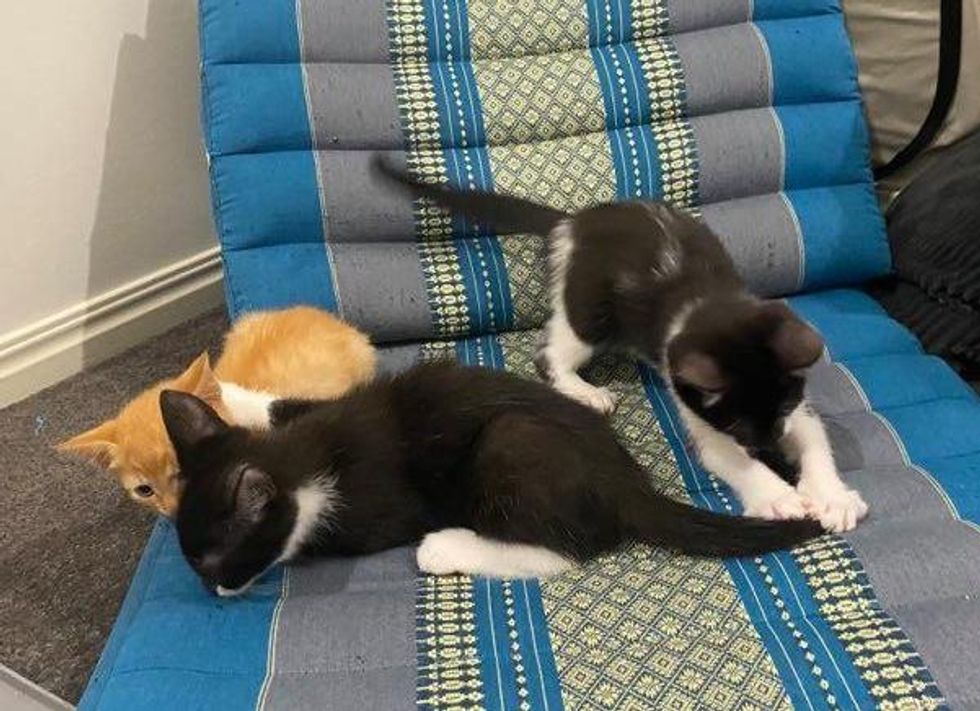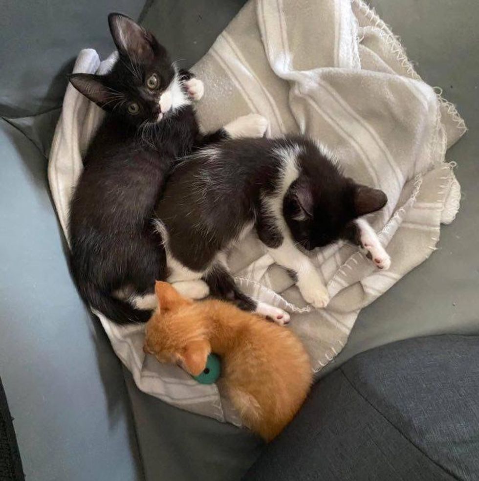 When he was ready to socialize, he was introduced to two feline sisters, Nala and Kiara, who quickly took him in as their own. "All three are playing together and snuggle up as a trio for nap time," Best Friends Felines shared.