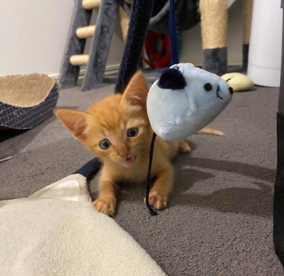 With his constant companions and all the cuddles he can get, the tabby is thriving and starting to grow into his big ears. He's at 590 grams and has almost tripled the weight and nearly caught up in size for his age.