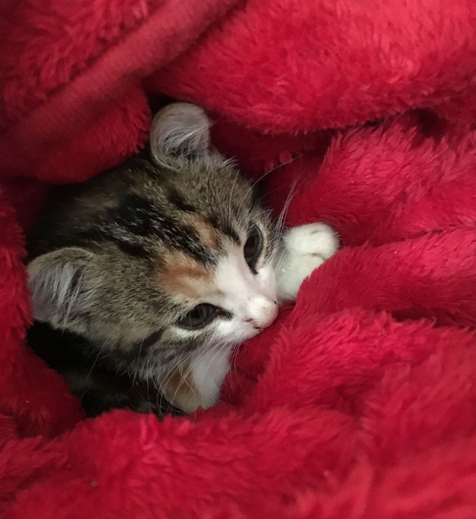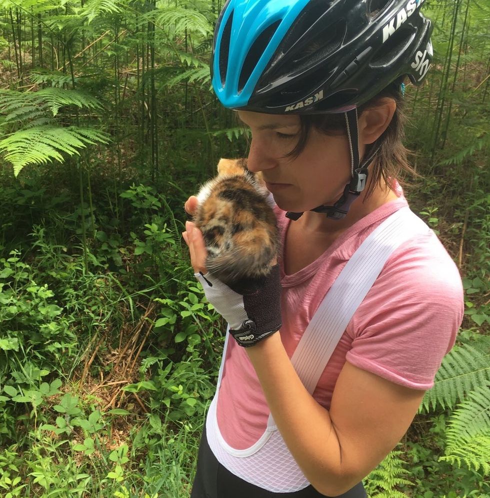 Céline (@tartemadame) and her husband, Daniel (@cycling.dan), were cycling in the countryside of central Brittany, France when they discovered a tiny calico wandering by herself.